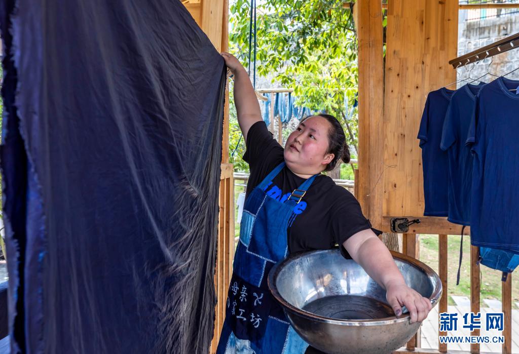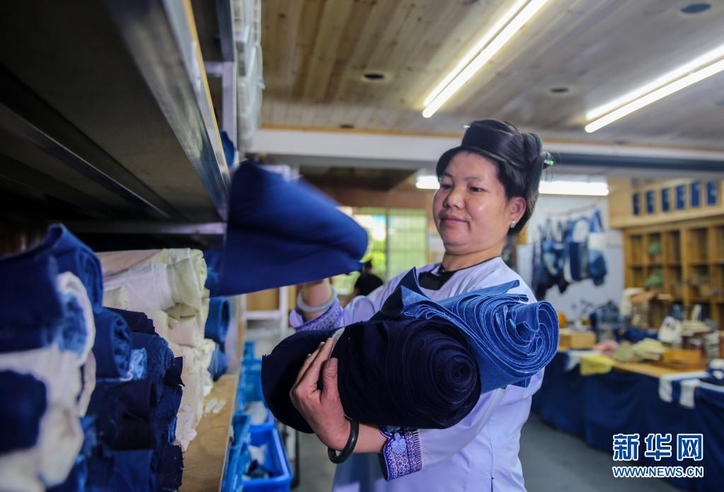 4月22日,工作人员在榕江县车民街道卧龙社区的民族产业工坊晾晒蓝染布料。