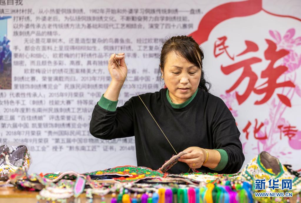 4月22日,工作人员在榕江县车民街道卧龙社区的民族产业工坊刺绣。