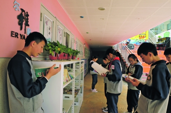 清镇市时光实验学校学生在诚信示范图书角阅读。