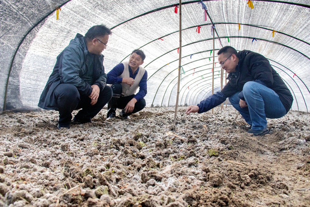 三穗县农技专家(左一)到武笔街道青洞村羊肚菌种植基地查看长势并向农户讲解注意事项。