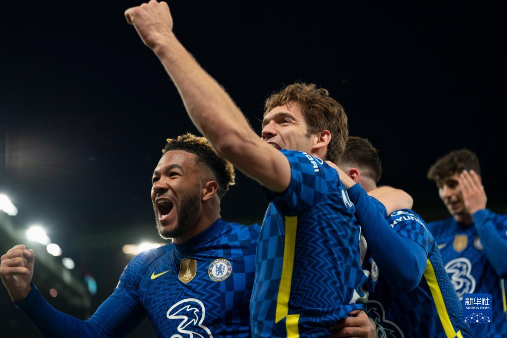 4月28日,切尔西队球员阿隆索(左二)进球后与队友庆祝。新华社发