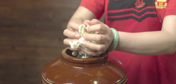 精选本地莲花白,洗净切成块后装入土坛中,加入老酸汤(多年重复循环使用)后加入清水稀释,并加入少量的盐,封坛腌制。夏天,24小时后即可开坛使用。冬天,则需要48小时左右。食用时从泡菜坛里捞出切成小片用小碟装好当作配菜。