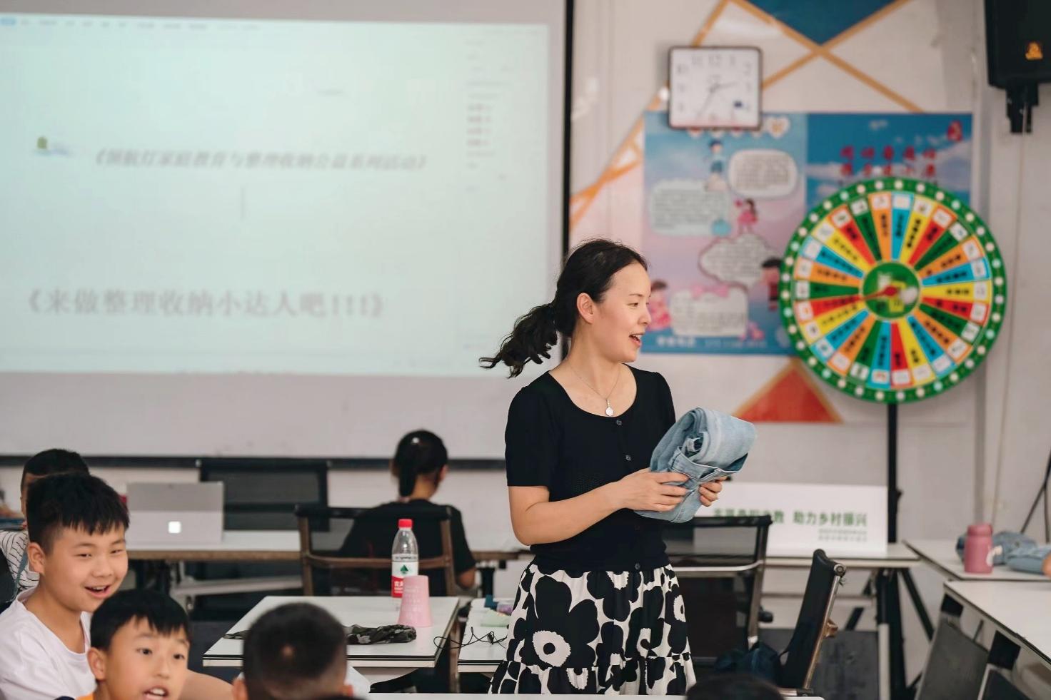 图为志愿者莫莫老师在市妇联巾帼“易服计划”清镇市站街镇枫渔社区暑期托管班,教孩子们怎么叠衣服,为孩子们传授整理收纳的基本生活技能。