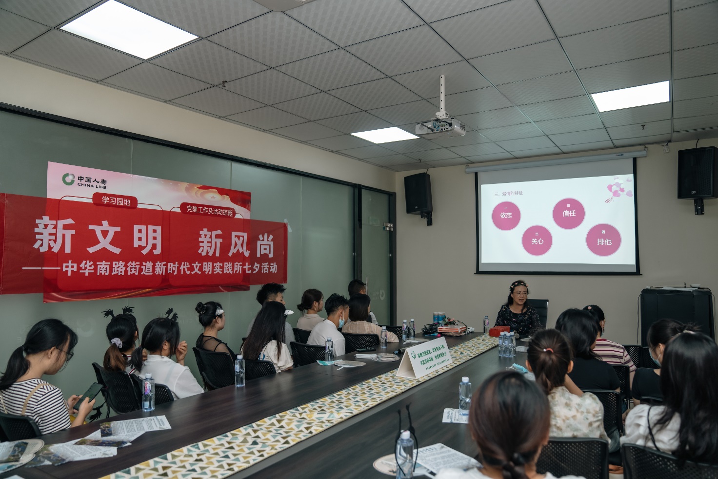 图为贵阳市警官职业学院何金琪老师,为南明区中南街道办事处组织的志愿者们开展幸福婚恋知识辅导。