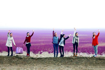 几位游客在碱蓬草“红海滩”拍照留念。