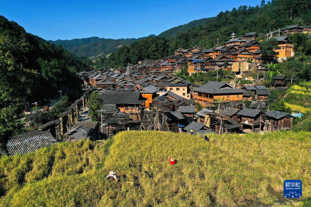 10月12日,贵州省从江县高增乡占里村的村民在采收“香禾糯”稻谷(无人机照片)。新华社记者 杨文斌 摄