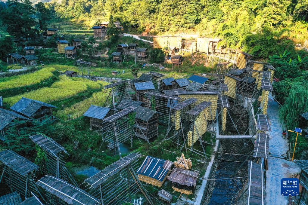 10月12日,在贵州省从江县高增乡占里村,村民将“香禾糯”稻谷挂在禾晾架上晾晒。新华社记者 杨文斌 摄