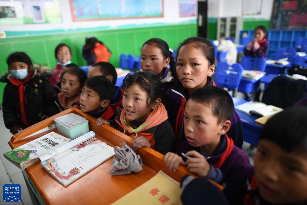 青海省果洛藏族自治州玛多县民族寄宿制中学二年级的学生在课间观看多媒体课件(2021年3月26日摄)。该校采用清洁取暖方式后,学生的学习和生活环境大为改善。新华社记者张宏祥摄