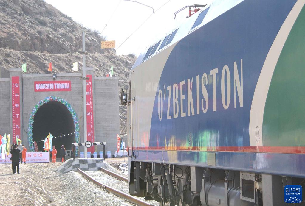 2016年2月27日,乌兹别克斯坦安格连-帕普铁路卡姆奇克隧道全隧贯通。这是一列专列停在隧道进口。新华社记者沙达提摄