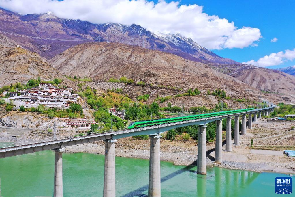 复兴号列车行驶在西藏朗县境内(2022年4月14日摄)。新华社记者觉果摄