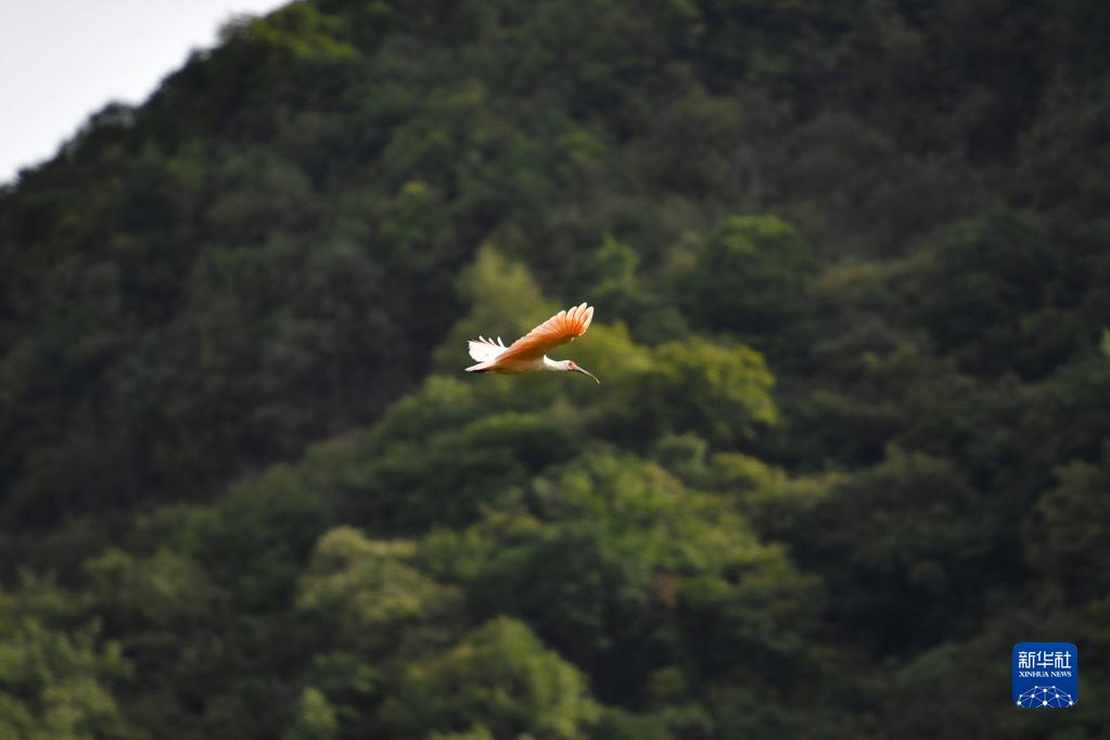 在位于秦岭南麓的陕西宁陕县寨沟村,朱鹮在天空中翱翔(10月10日摄)。