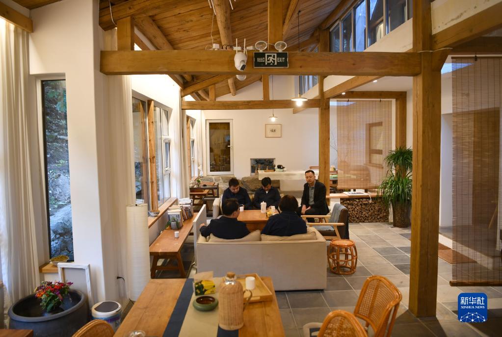 游客在位于秦岭南麓的陕西宁陕县沙沟村一间民宿的客厅内休息聊天(10月9日摄)。