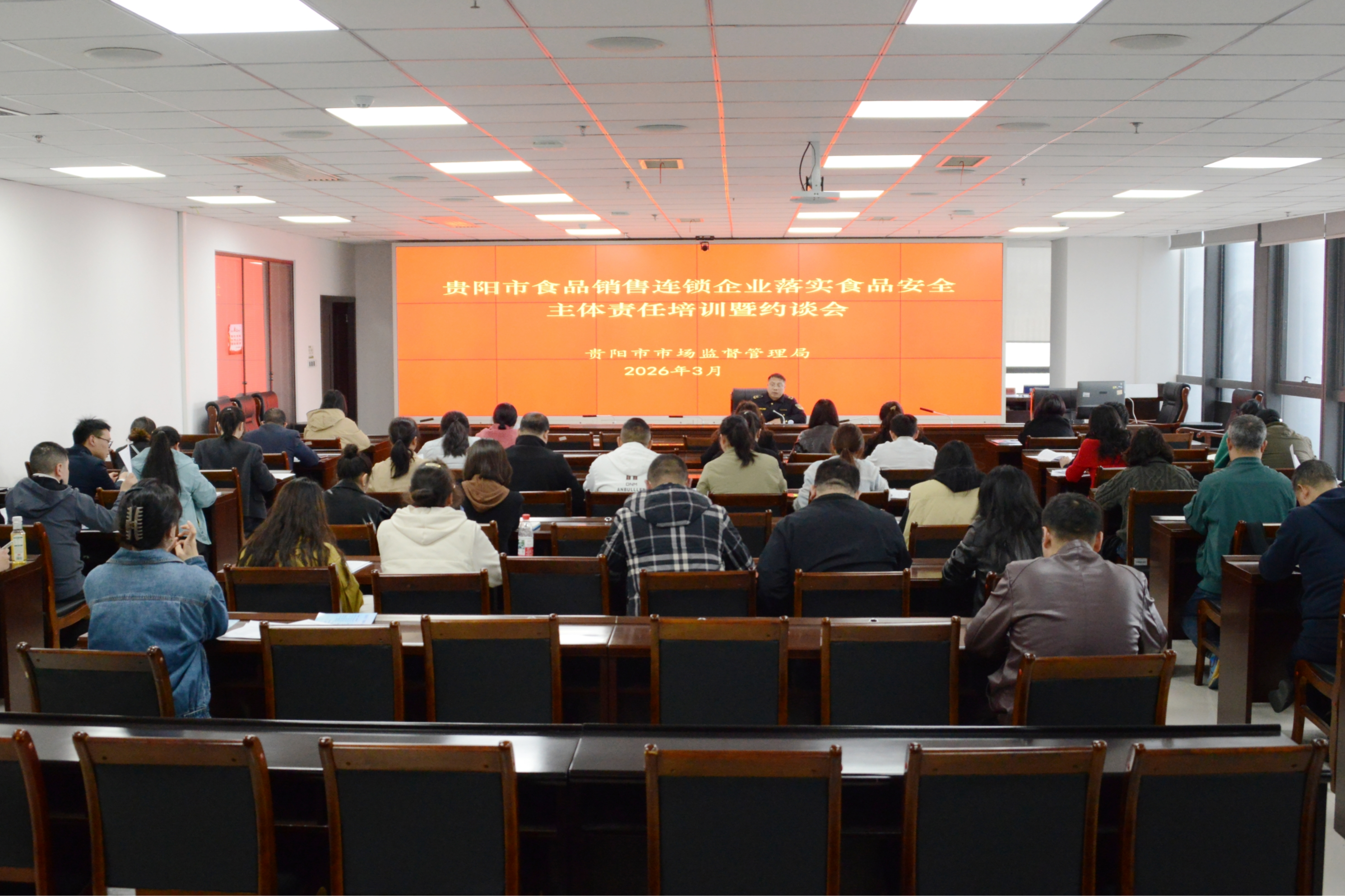 3月13日,市市场监管局组织召集贵阳市34家食品销售连锁总部负责人,开展食品安全专题培训及集中约谈工作,推动食品销售连锁行业高质量规范发展。