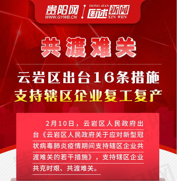 2月10日,云岩区人民政府出台《云岩区人民政府关于应对新型冠状病毒肺炎疫情期间支持辖区企业共渡难关的若干措施》,支持辖区企业共克时艰、共渡难关。