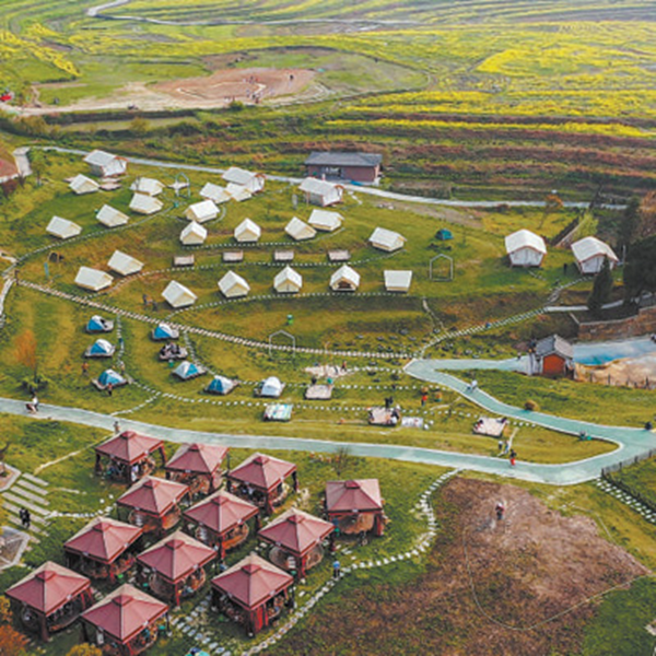 打开农家民宿的柴门,就走进春意盎然的风景里。一条平直的乡村水泥公路,指引我向前漫步。路的两旁,五彩缤纷的杜鹃花顶着一颗颗露珠。再往前走,眼前出现一片美丽的风景:一顶顶造型各异、色彩多样的帐篷,分布在草丛、山谷和森林间。有的还透出隐隐的光亮,像天空中闪烁的星星。一看路边的指示牌,才知道这是村里开发的露营基地,这些旅游设施是专为外地来的游客设计的。