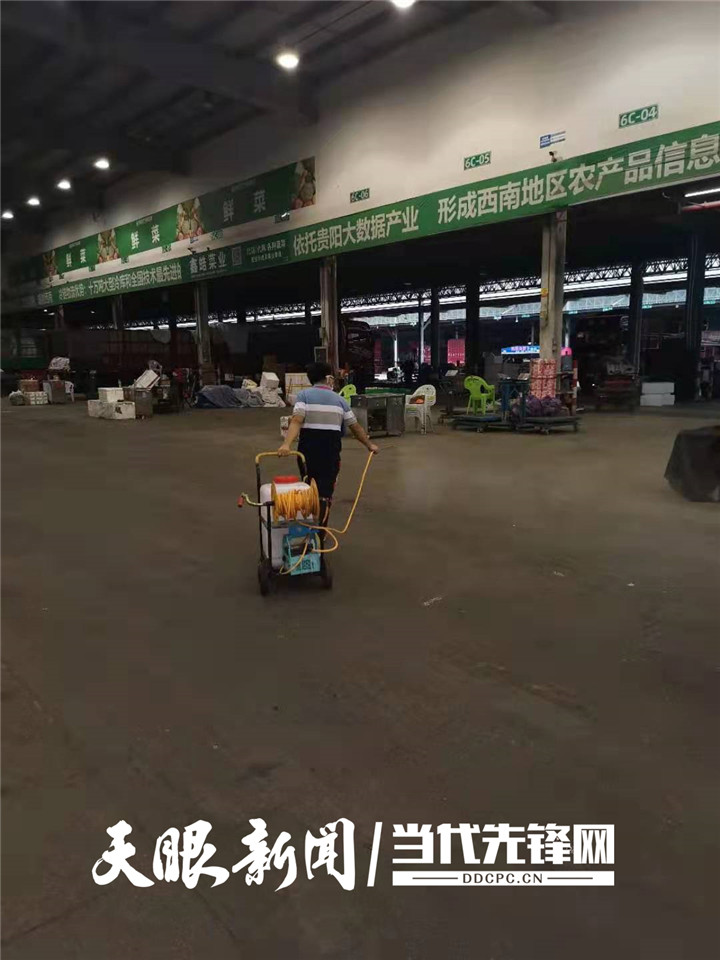 8月16日凌晨3时许,贵阳农产品物流园工作人员张磊像往常一样推着电动喷雾器在蔬菜区6号棚开展消杀工作,和他一起上岗的其他小伙伴分别对4、5、7、8、10、22等号棚开展消杀工作。消杀结束后,将迎来最早入市的一批商户和采购商。据悉,这是贵阳农产品物流园多措并举、强化疫情防控每日必做的第一课。
