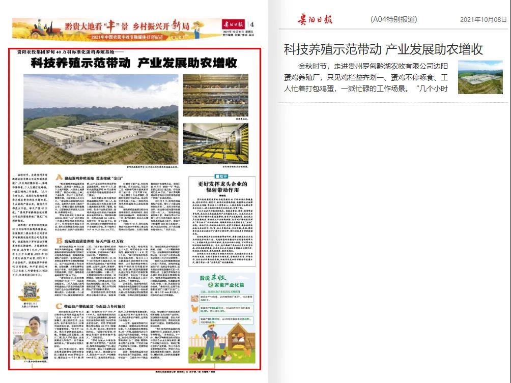 10月8日,《贵阳日报》刊发《贵阳农投集团罗甸40万羽标准化蛋鸡养殖基地——科技养殖示范带动 产业发展助农增收》,报道贵阳农投集团罗甸40万羽标准化蛋鸡养殖基地采用“企业+村集体+农户”运营模式,通过政府引导、企业运作、农户参与的方式,完善利益联结机制,给村民带来了致富新希望。具体报道如下: