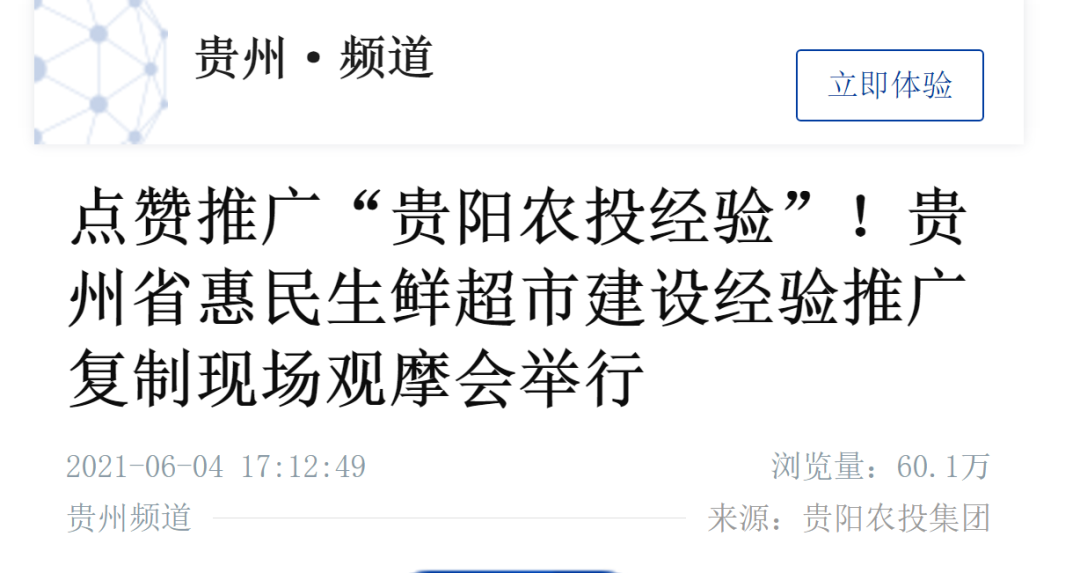 6月3日,省商务厅组织观摩团到贵阳市农投集团开展全省惠民生鲜超市建设经验推广复制现场观摩会,新华社对此进行了报道,并获得广大网友关注,目前浏览量已突破60万,具体如下: