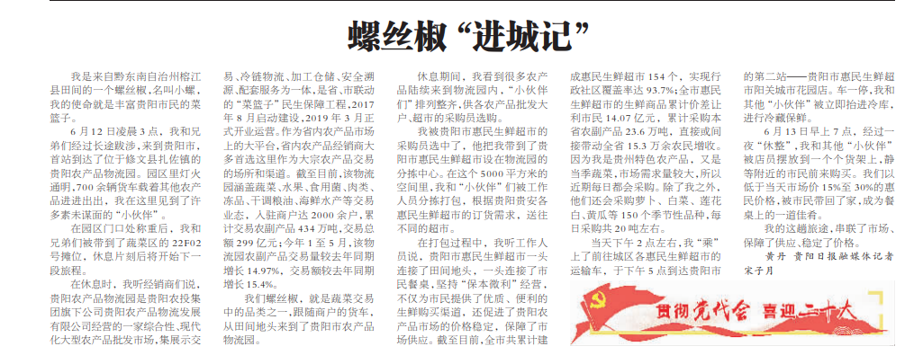 我是来自黔东南自治州榕江县田间的一个螺丝椒,名叫小螺,我的使命就是丰富贵阳市民的菜篮子。