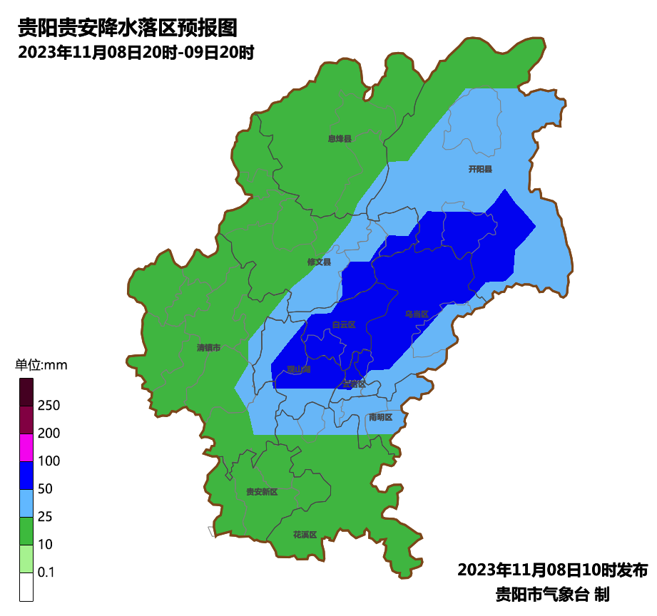图1. 贵阳贵安11月8日20时至9日20时降水落区预报图