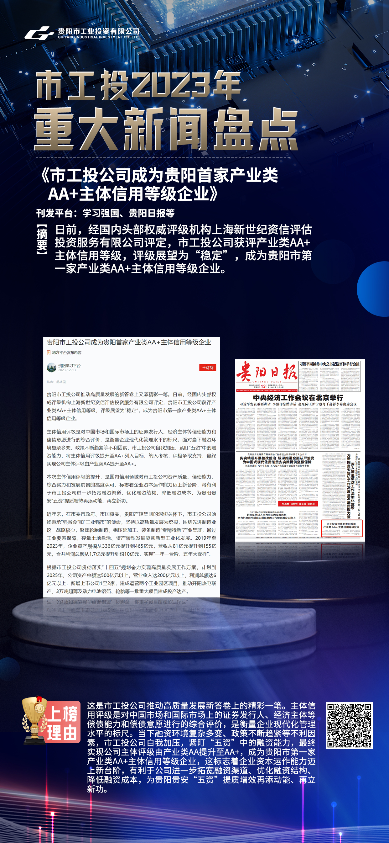 2023年是极具挑战、极为精彩的一年,市工投公司始终坚持以高质量发展为统揽,持续深化国企改革,大力发展重点产业,不断做强工业企业、做大工业产业、做优工业园区,在“工业强市”的道路上奋发突围,为贵阳贵安高质量发展注入强劲动能。
