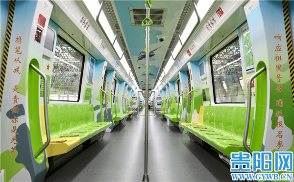 贵阳市“强军号”地铁专列于2021年7月30日发车,是贵州省首列强军主题地铁专列。“强军号”地铁专列已成为国防教育的“移动课堂”,走进第一节车厢,迎面看到的是中国人民解放军三军仪仗队高举军旗和“听党指挥、能打胜仗、作风优良”的醒目标语,令人精神振奋。