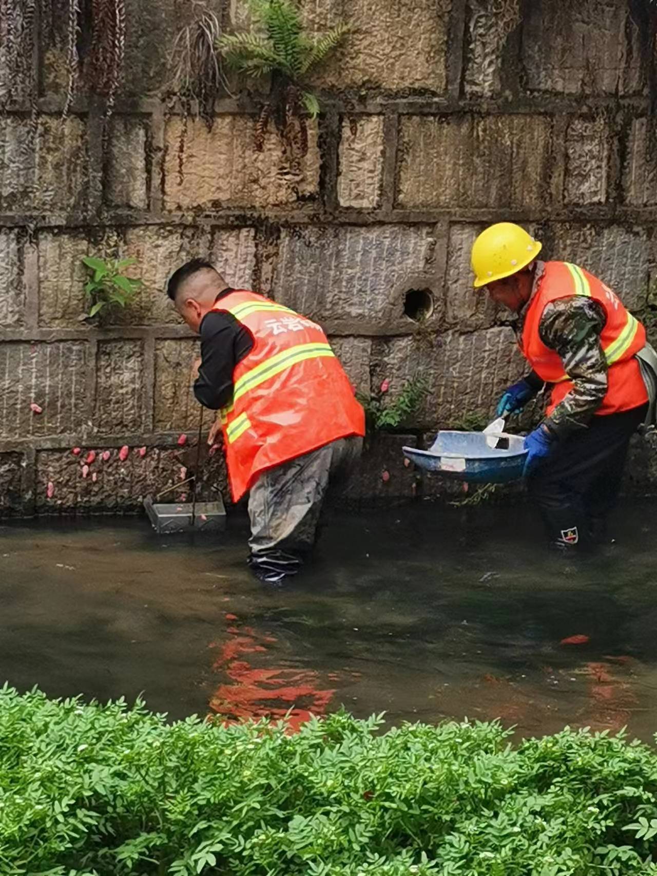 工作人员清理市西河福寿螺。