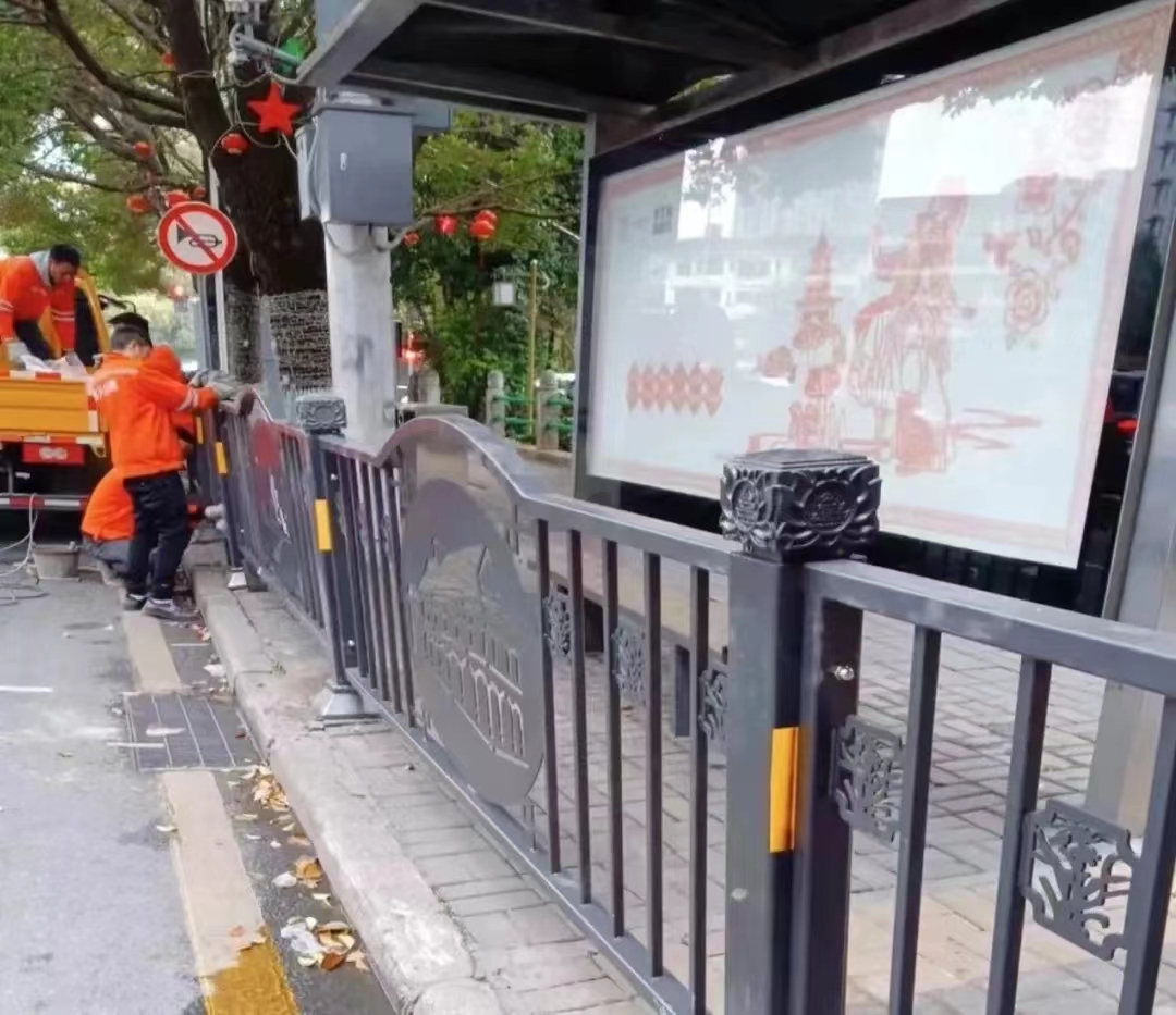 工作人员在市南路废弃公交站安装护栏。