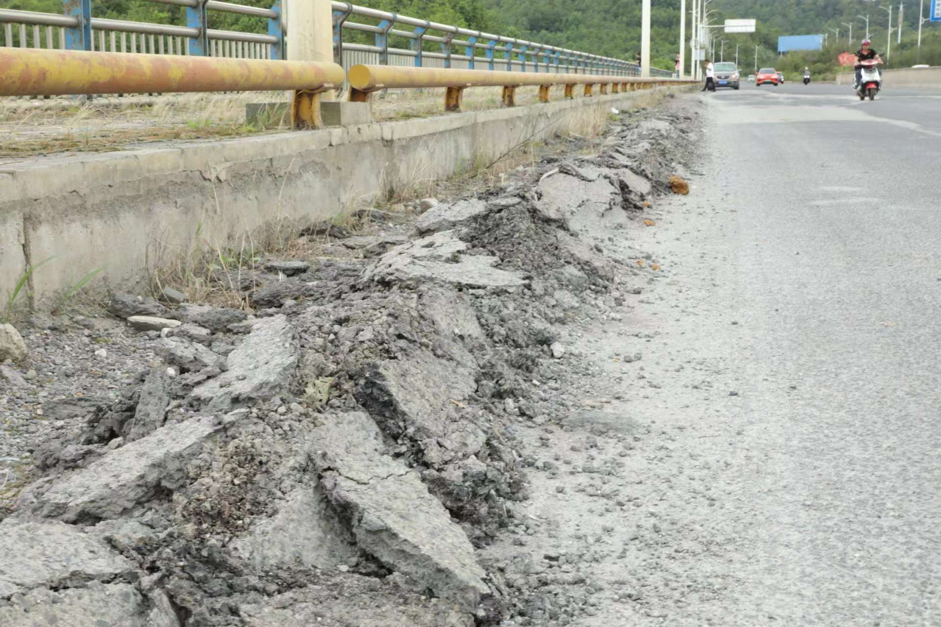 未修复前,贵钢大桥道路最外侧的路面发生隆起和沙化。