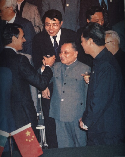 1987年4月13日,邓小平出席中国和葡萄牙政府关于澳门问题的联合声明签字仪式。图为邓小平与葡萄牙总理席尔瓦举杯庆贺