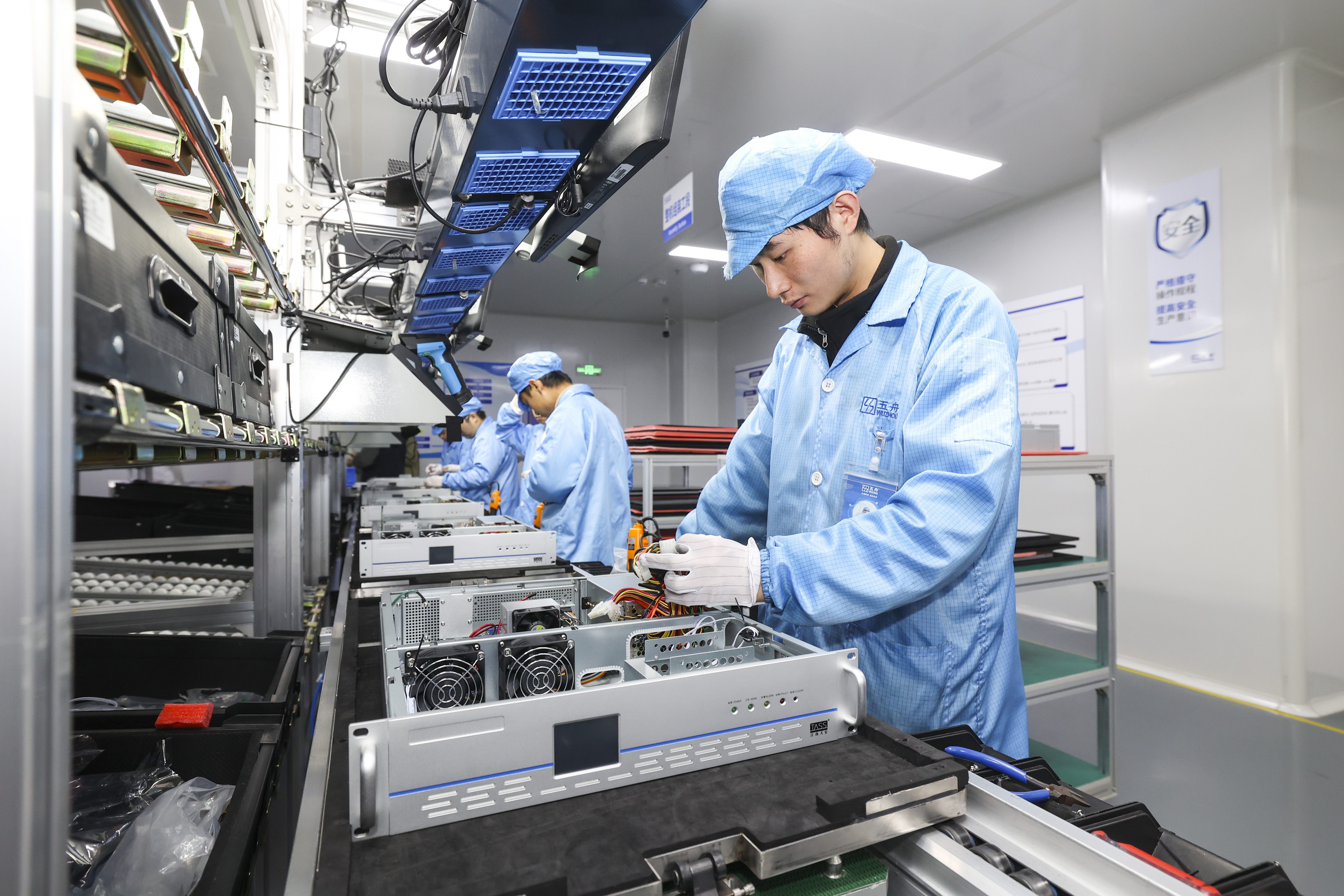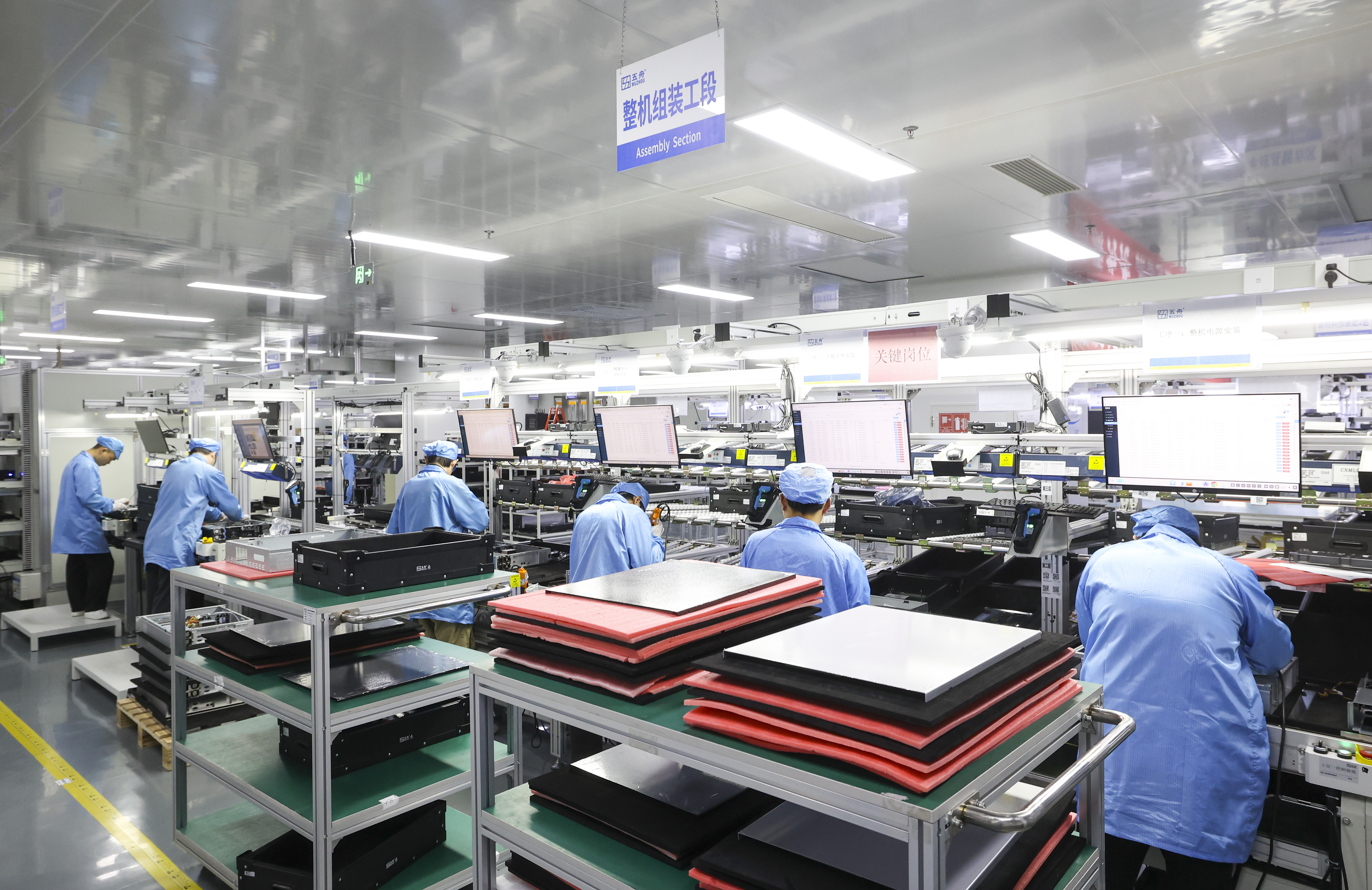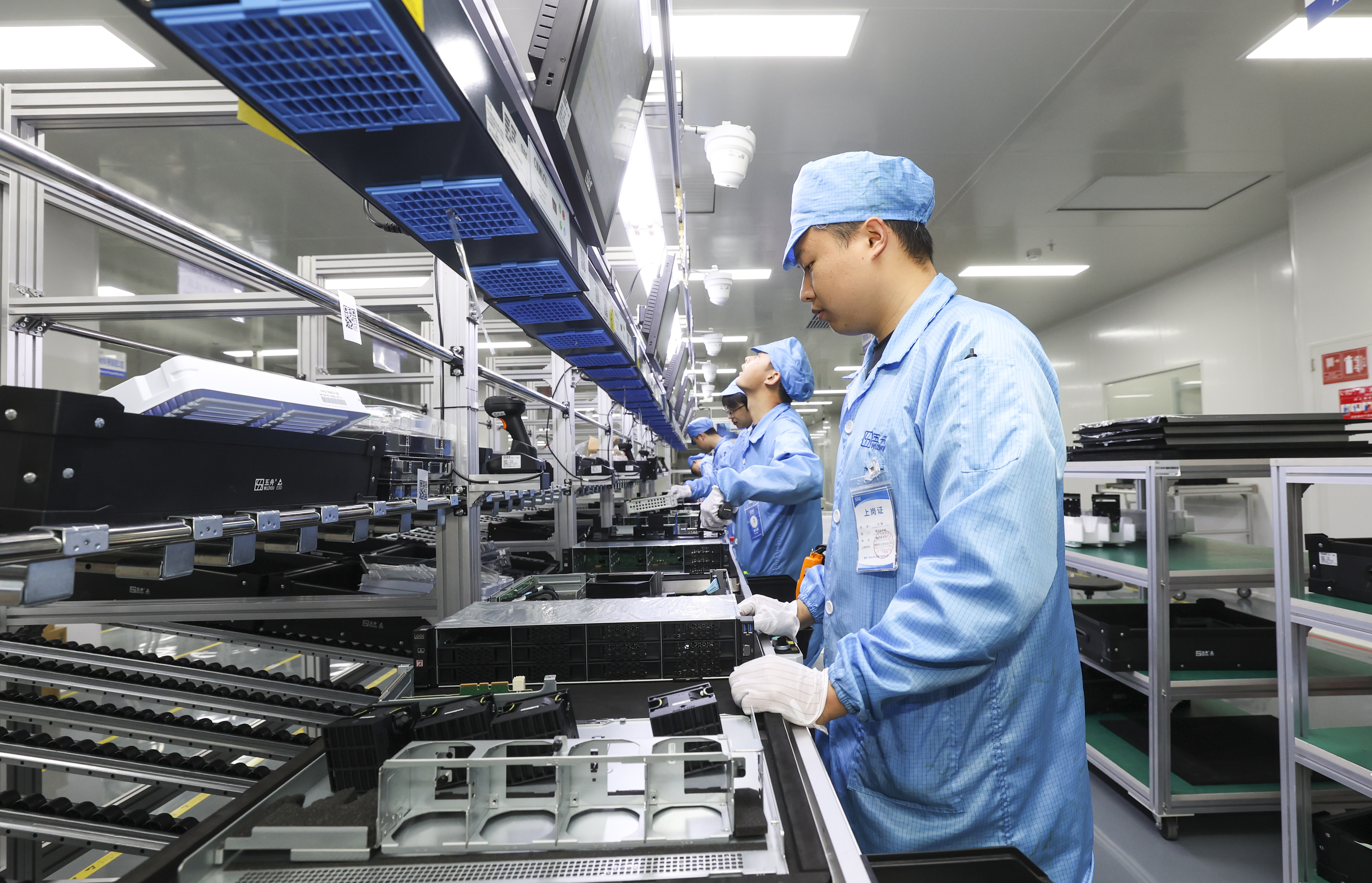 走进贵州广电五舟科技有限公司生产车间,只见车间宽敞明亮、功能区划分明确,现代化生产线有序运转,工人们身着防静电服专注地对智能算力产品进行装配和调试。经老化测试、多次质检合格后,一台台崭新服务器被整齐打包,即将往外发送。