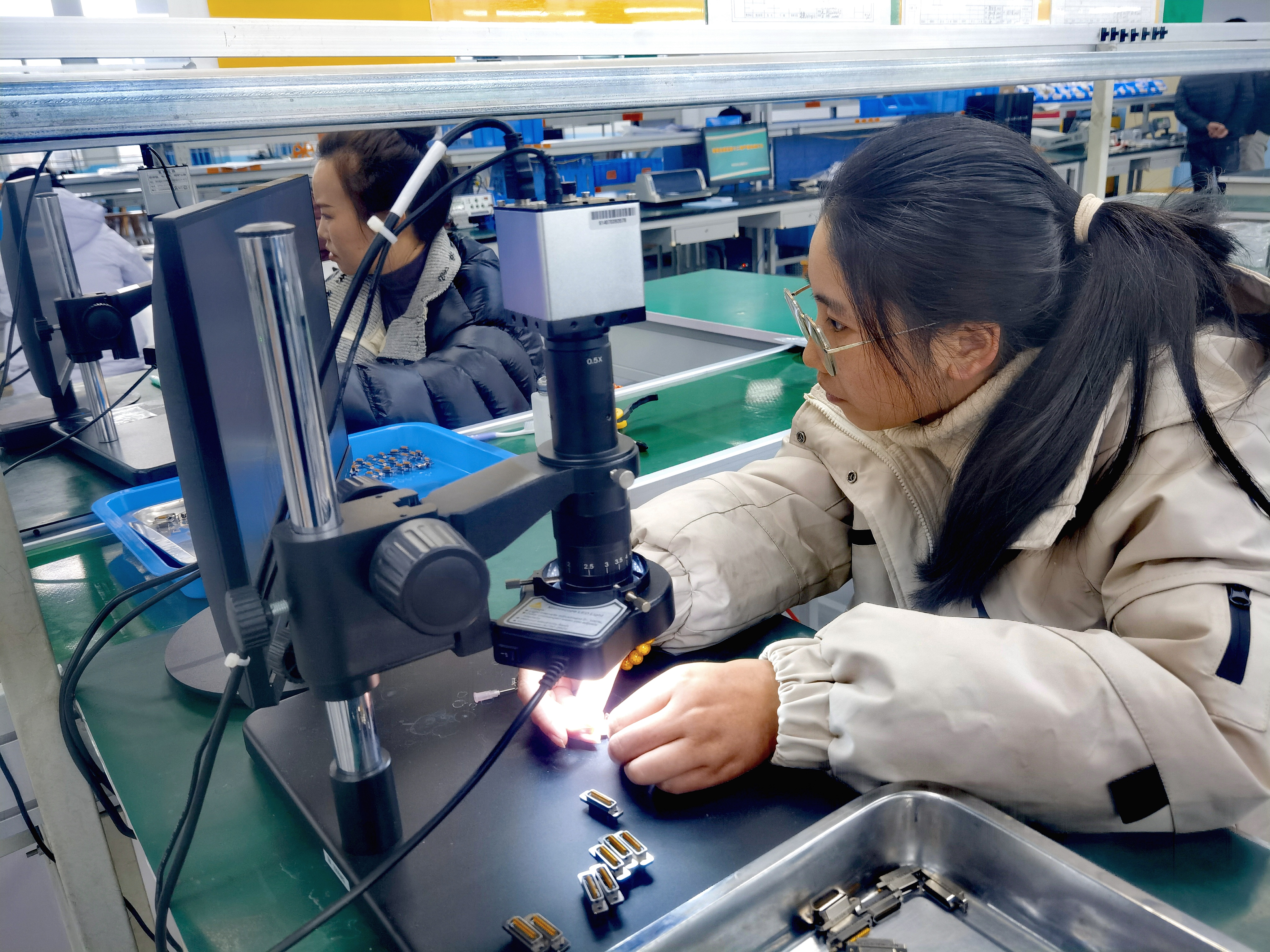 2月7日,节后第三天,记者走进贵州贵安新区东江科技有限公司二楼装配车间,只见工人们正忙碌工作,各类连接器产品不断成型产出,一派全力以“复”赶订单的火热景象。