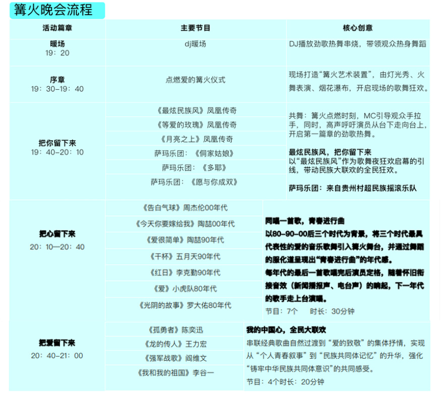 白天设 K 歌擂台、全民共舞、铁骑互动,夜晚开启篝火晚会并融合凤凰传奇等民族歌舞与年代经典曲目,同步呈现贵州非遗技艺与特色美食市集。