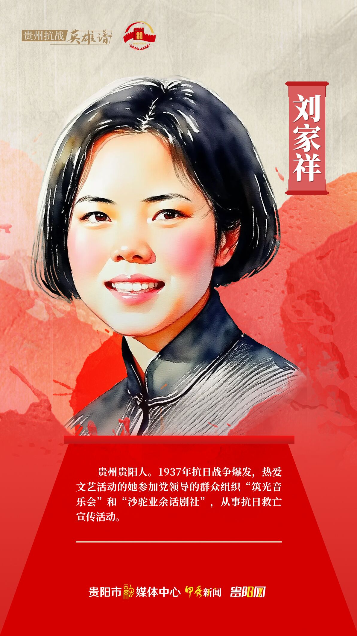 民国26年(1937年)抗战爆发后,举国上下掀起了轰轰烈烈的抗日救亡运动。贵阳成立“贵州省学生救国联合会”(简称“学联”),刘家祥积极参加“学联”组织的抗日救亡运动。后学联遭到国民党贵州当局破坏,蓬勃发展的学生运动被镇压,热爱文艺活动的她随即转入中共地下组织领导的“筑光音乐会”和“沙陀业余话剧社”,继续从事抗日宣传活动。