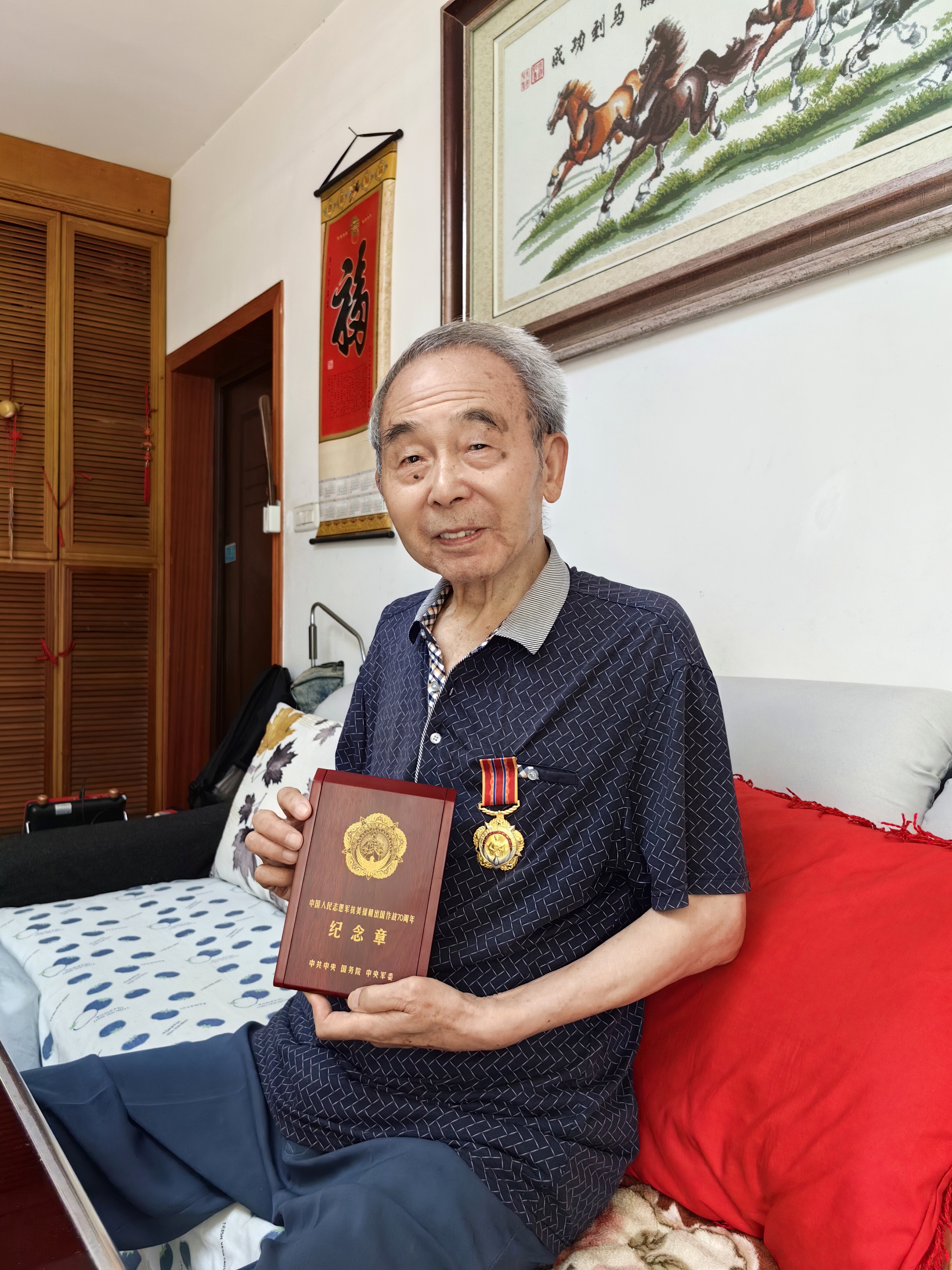 刘承初老人展示中国人民志愿军抗美援朝出国作战70周年纪念章