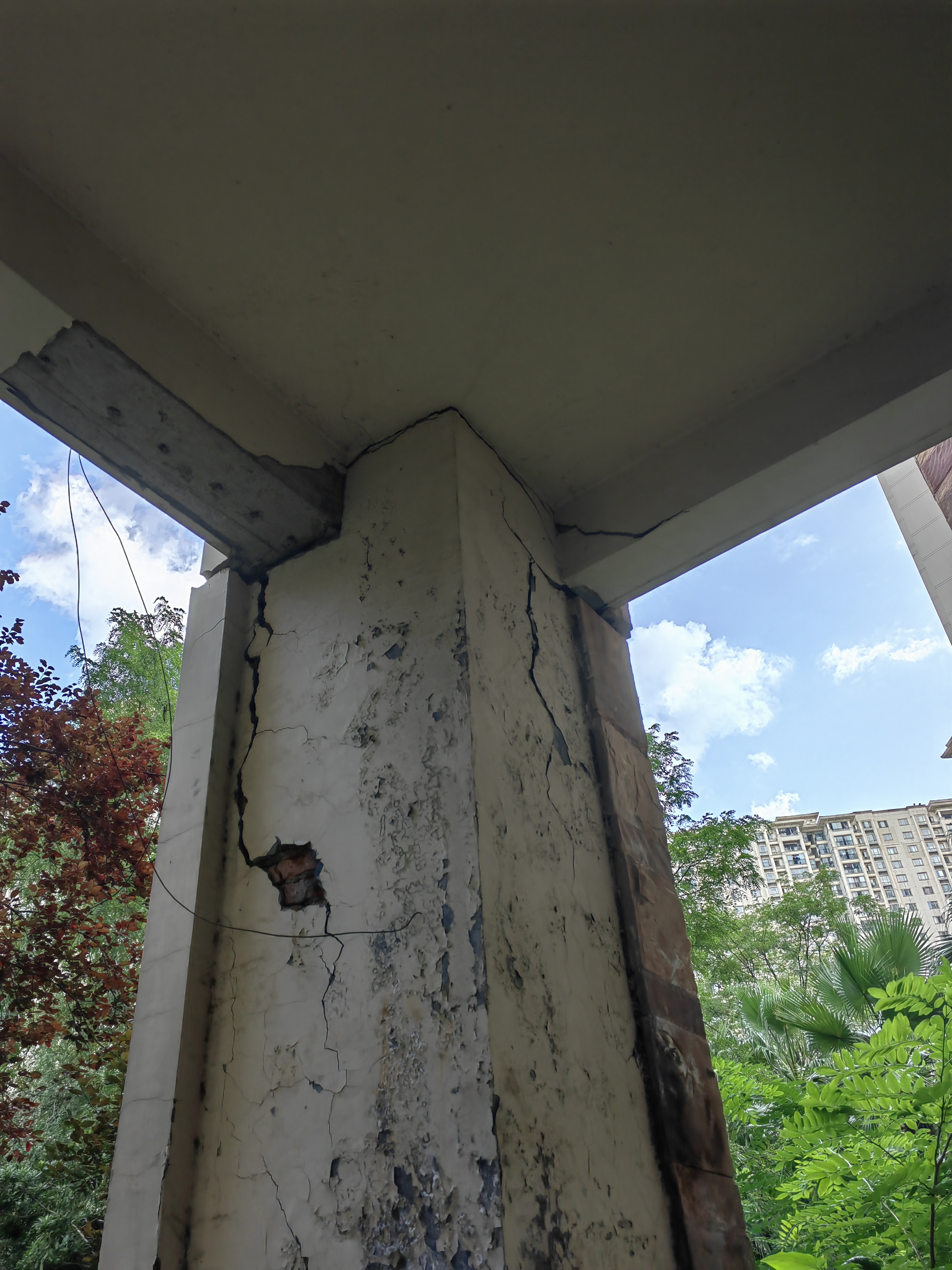 柱体开裂、外墙脱落,可见内部红色砖块。