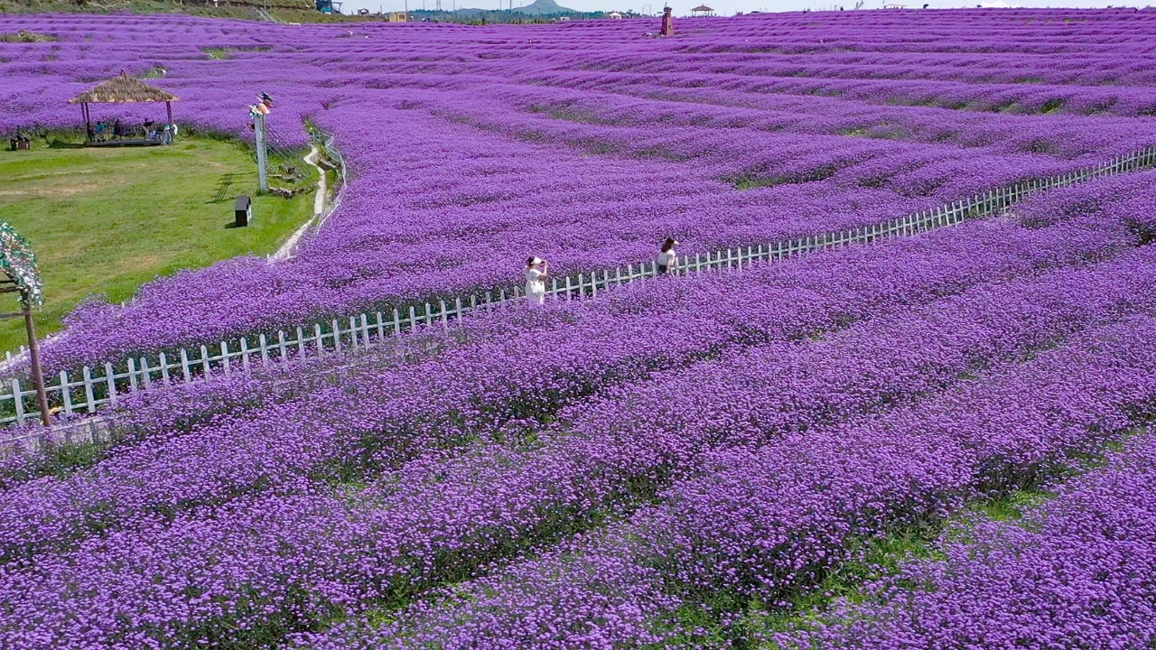 漫步石门锦绣田园景区,漫山遍野的马鞭草犹如一片浪漫的紫色海洋,雨后初晴的阳光穿过云层,为花海镶上一道金边,给人带来无尽的惊喜和愉悦。紫色花海与翠绿的草甸、花丛中的橙色风车、远处的白色帐篷和乡村民居相呼应,形成绝美的“多巴胺色系”,吸引游客穿梭于白色栅栏围成的花间小路,不时拍照“打卡”。