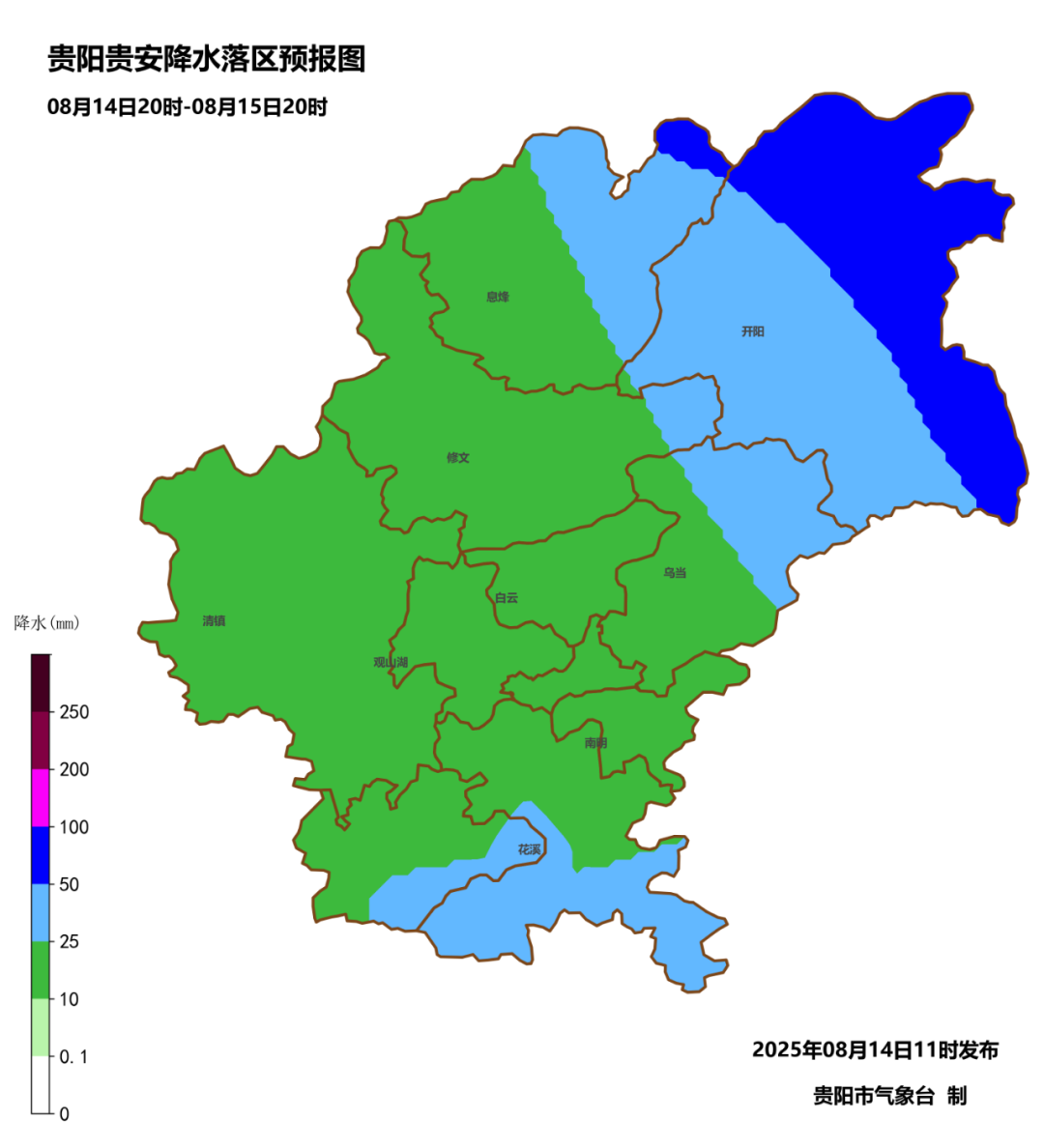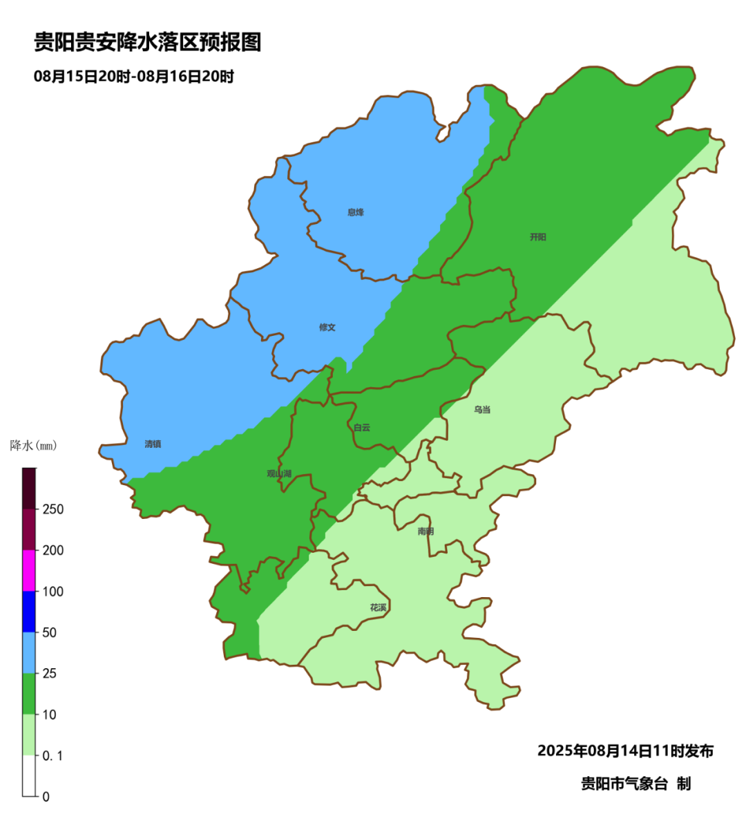 8月14日夜间到15日白天,阴天有阵雨或雷雨,雨量中到大雨,主城区气温20~25℃;