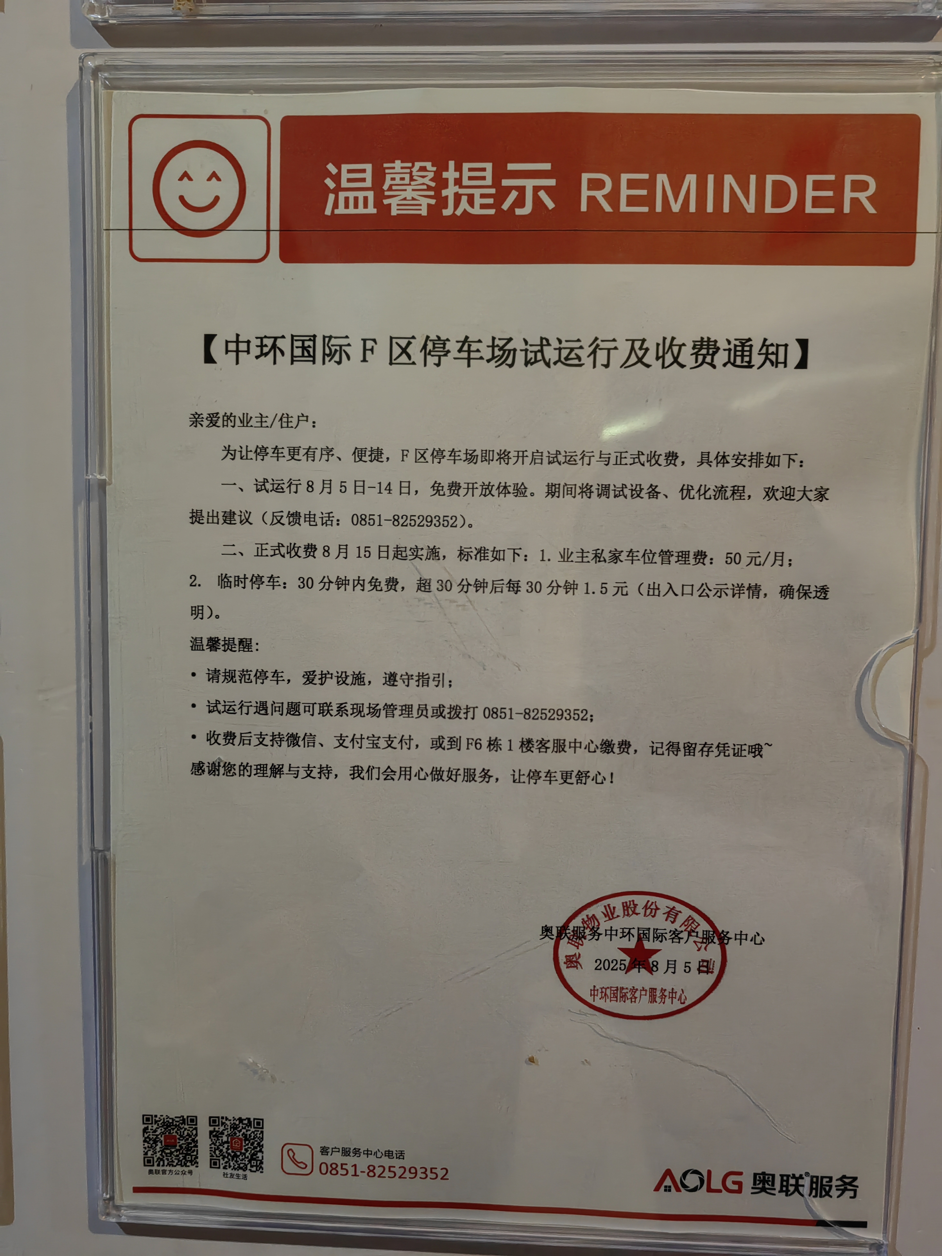 据悉,2024年10月,中环国际小区业主因不满前物业公司管理,小区业委会通过招投标形式,引进奥联物业有限公司为小区新物业。今年8月15日,奥联物业通过单元楼张贴通知、小区业主群发送通知等形式,告知F区业主——从9月15日开始,将按照“固定车位月租50元/月、无固定车位月租190元/月,临时停车1.5元/30分钟”的标准开始收费。