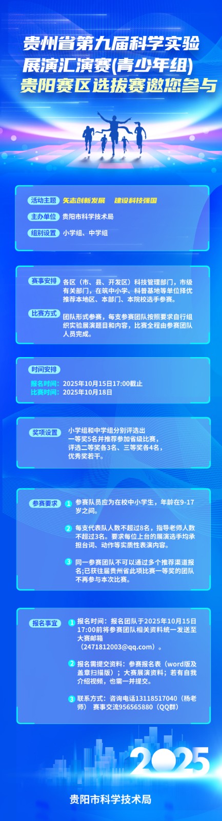此次贵州省第九届科学实验展演汇演赛(青少年组)贵阳赛区选拔赛的举办,将为贵阳青少年提供一个展示科学才华、交流科学思想的优质平台。期待广大青少年踊跃报名,在科学的舞台上绽放光彩。