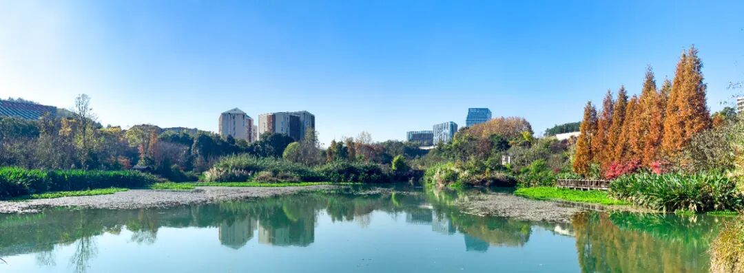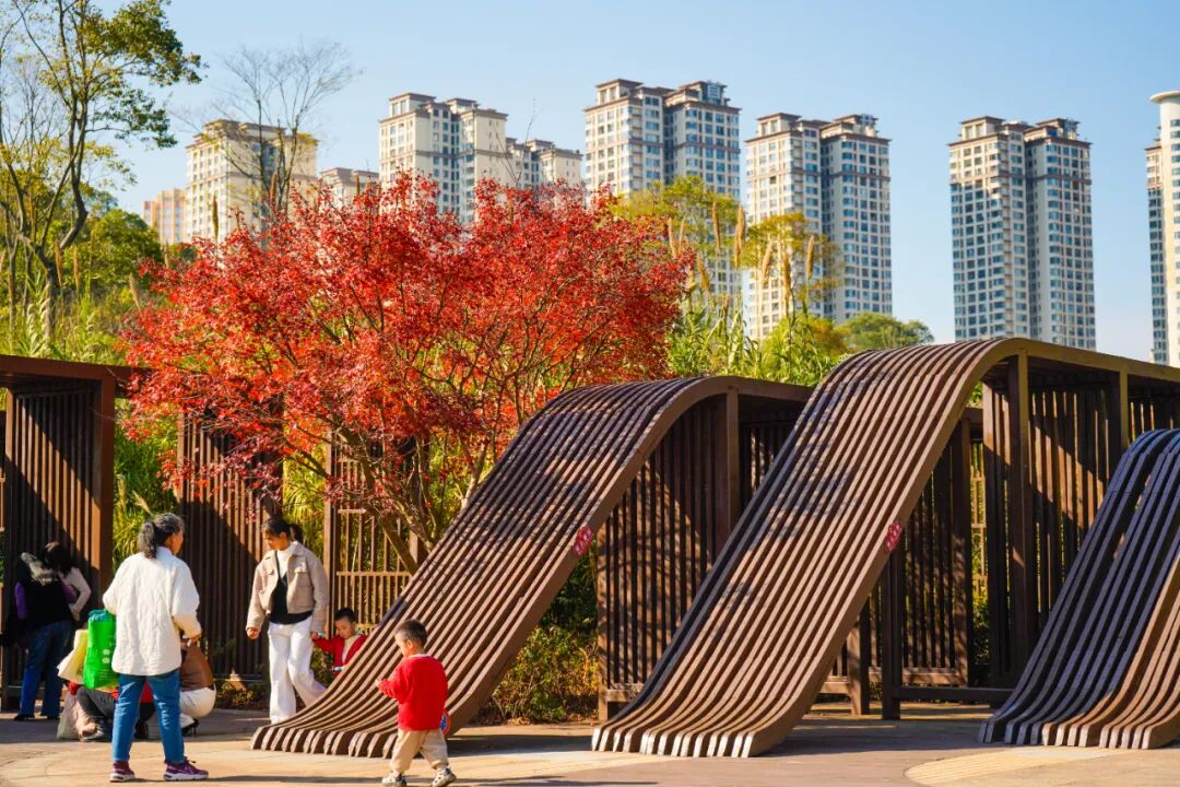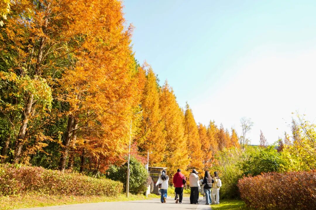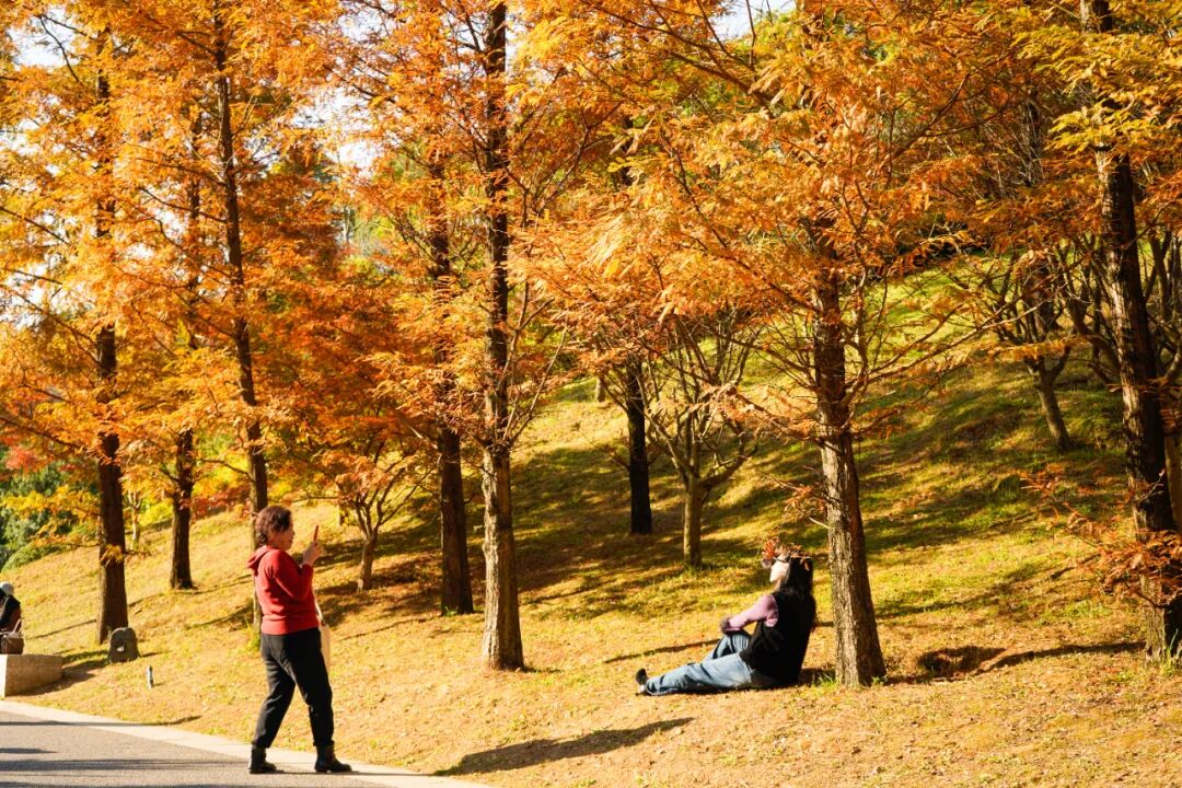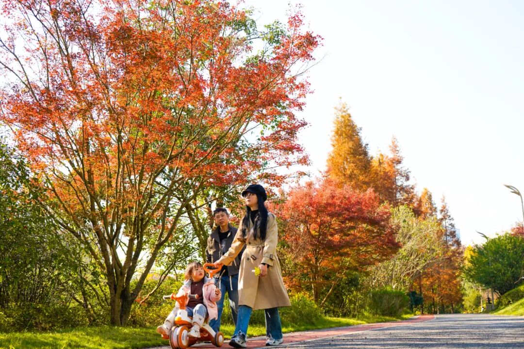 步入公园,随处可见动人的秋冬画卷:银杏、枫香、栾树、杉木等30余种彩叶植物纷纷变黄、转红,呈现出“层林尽染”的诗意景致。