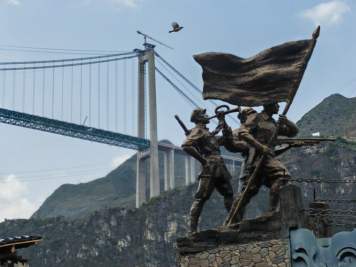 这是2025年4月28日拍摄的贵州花江峡谷大桥。9月28日,新的世界第一高桥——贵州花江峡谷大桥建成通车。近处的则是一座建于1898年、由14根铁链组成的花江铁索桥。1935年4月,中央红军右路纵队挺进黔西南,死守花江铁索桥这一战略要冲,确保红军主力顺利抢渡北盘江。新旧两座桥,横跨着百年历史风云,见证着血与火的艰辛历程 。