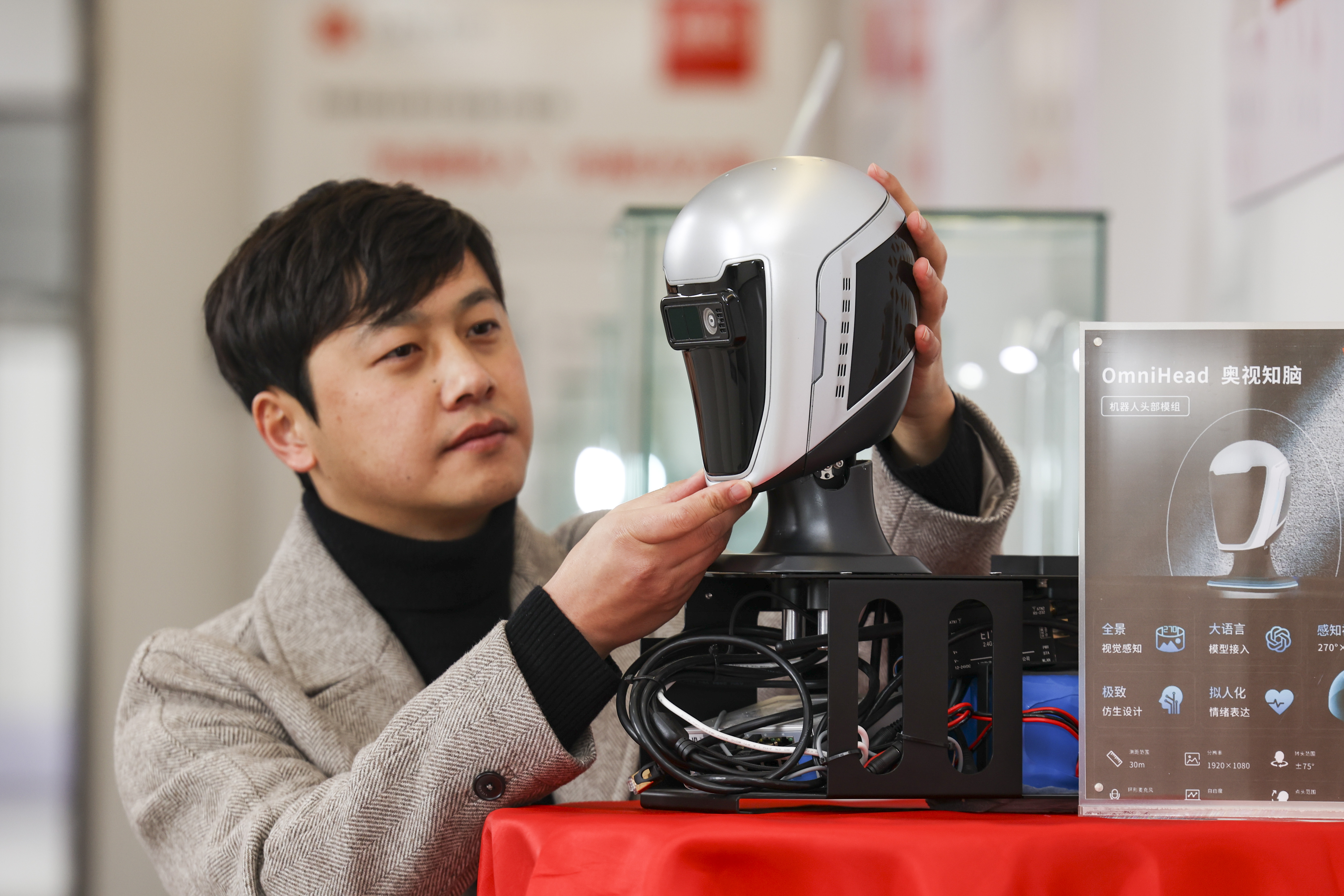工作人员在展示区展示生产的人形机器人头部模组OmniHead(奥视知脑)。