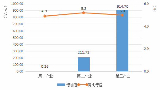 根据区(市、县)生产总值统一核算结果,2025年云岩区生产总值1126.69亿元,按不变价格计算,同比增长5.0%。其中,第一产业增加值2577万元,增长4.9%;第二产业增加值211.73亿元,增长5.2%;第三产业增加值914.70亿元,增长5.0%。