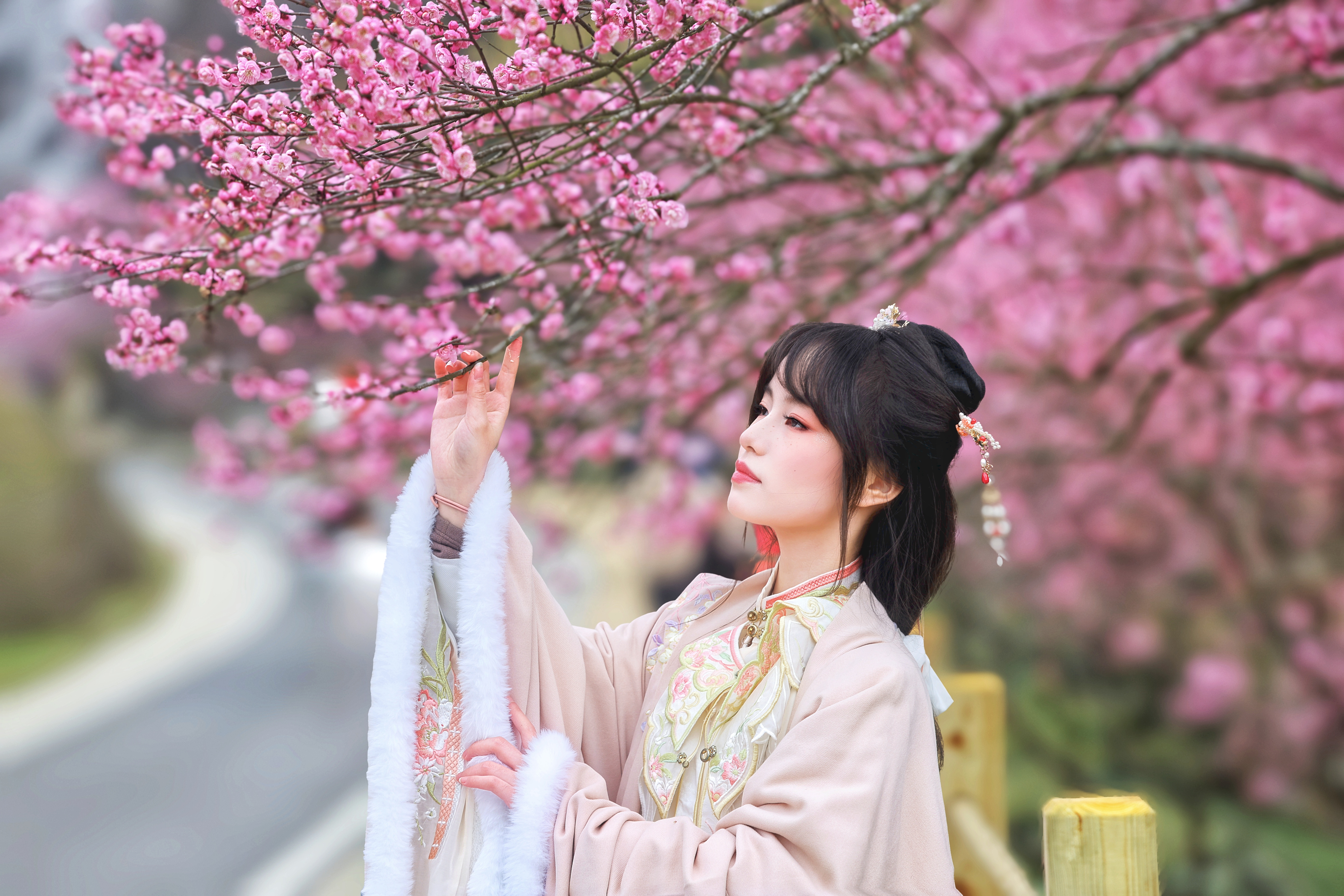 梅花与汉服的内在契合,是贵州梅园持续吸引写真爱好者前来拍摄的重要原因。作为传统名花,梅花的清雅风骨与汉服的形制美学相得益彰,不同款式的汉服与各类梅花相映成趣、气韵相融。汉服爱好者唐婷展示着拍摄成果:“我特意选了淡粉色宋制汉服,与宫粉梅的色调自然呼应,梅花的清冷中和了汉服的繁复,每一张照片都尽显古韵雅致。”