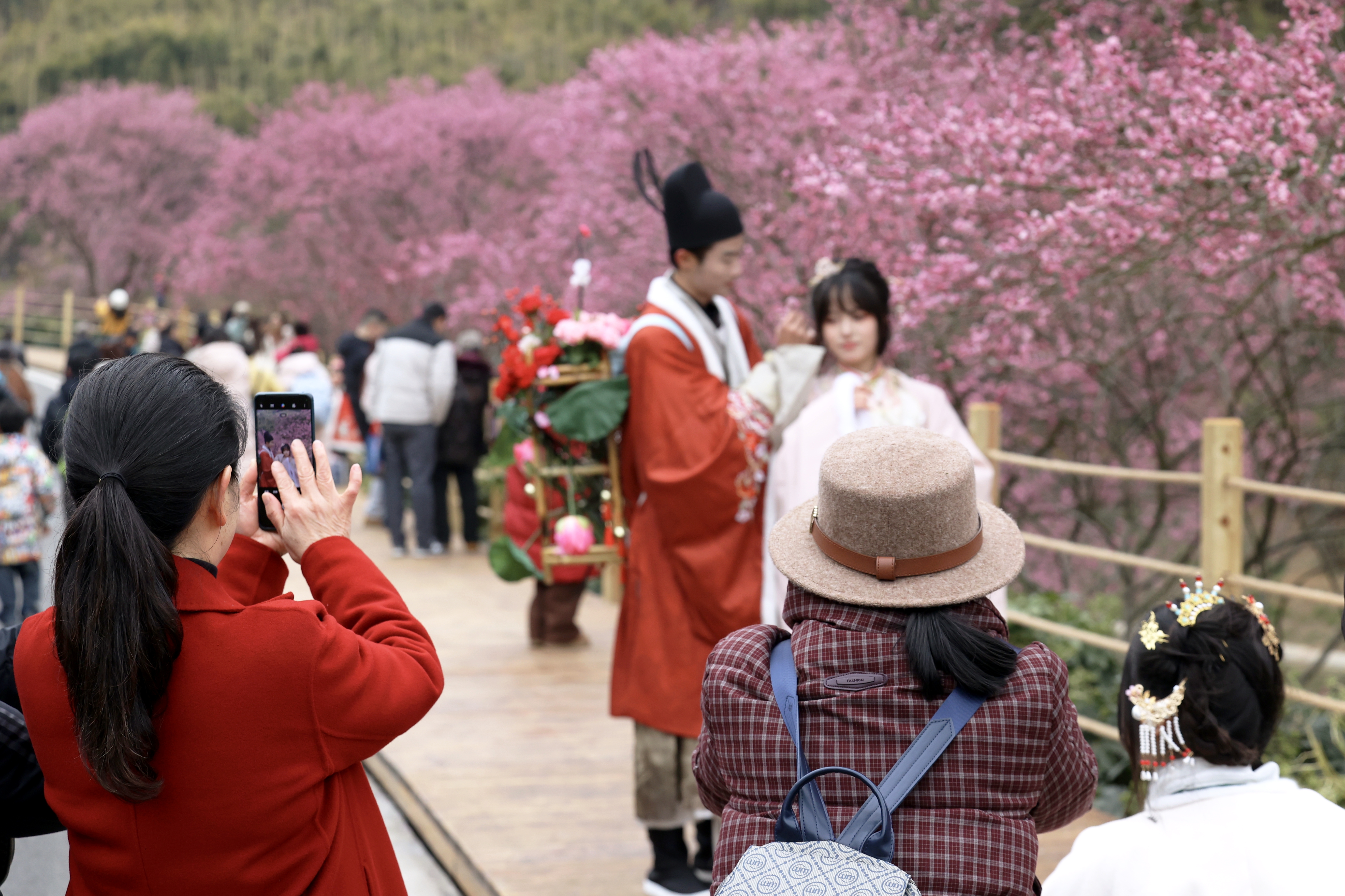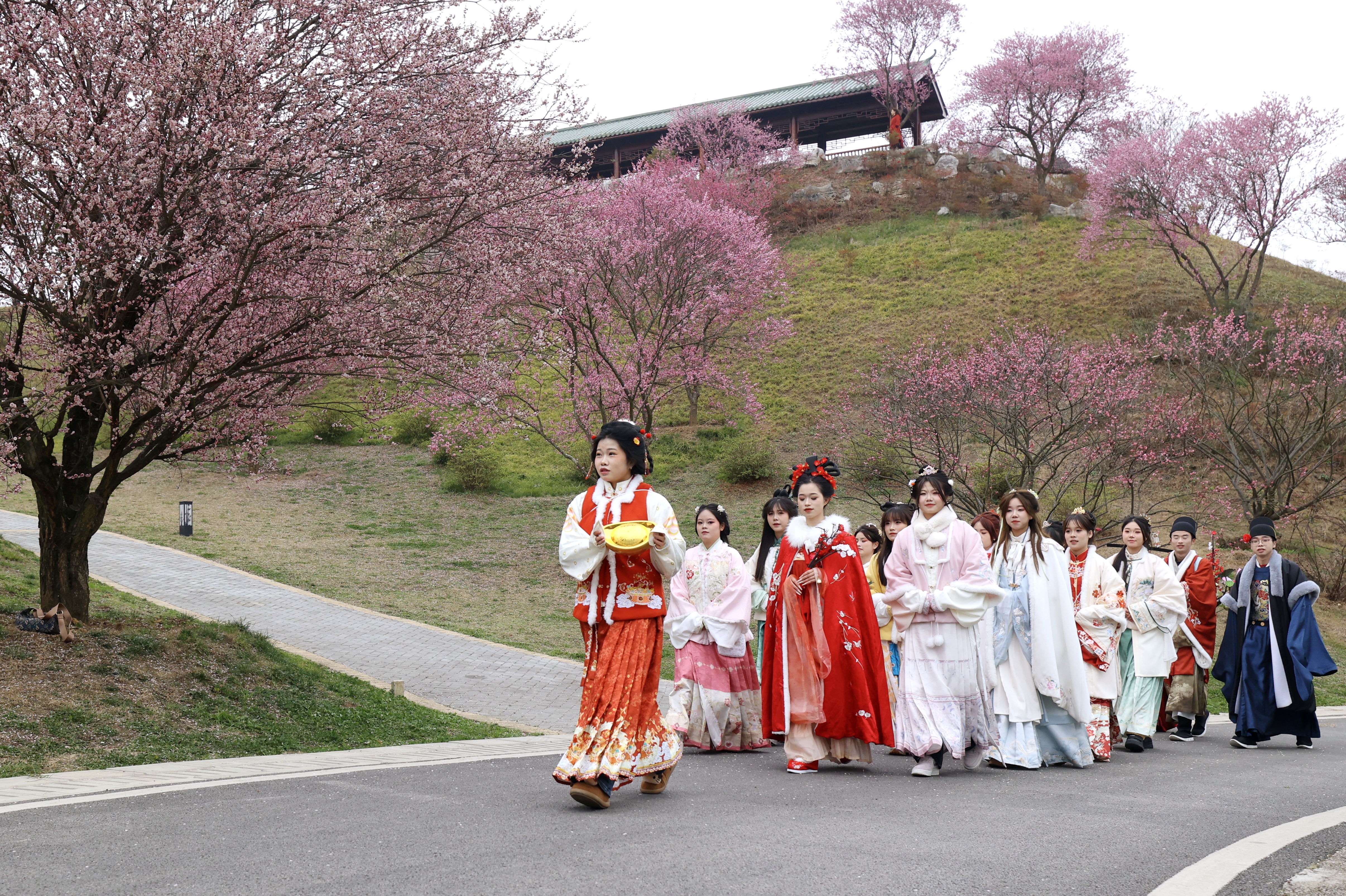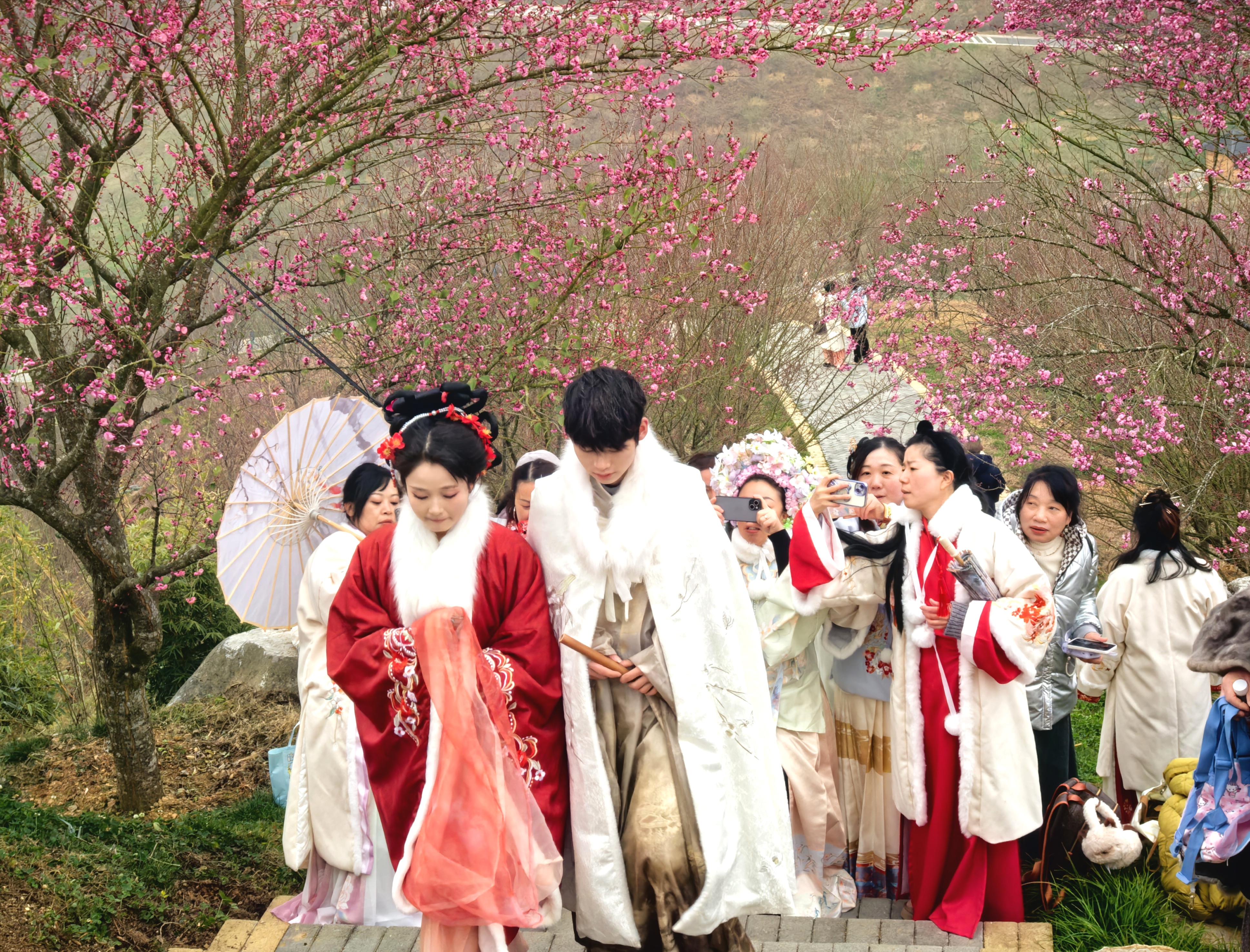 现场除了游人倚梅浅笑、沿栈道信步的景致,园区组织的汉服雅巡队伍更添韵味,吸引摄影师们快门频响,将梅与汉服交织的美感定格成册。