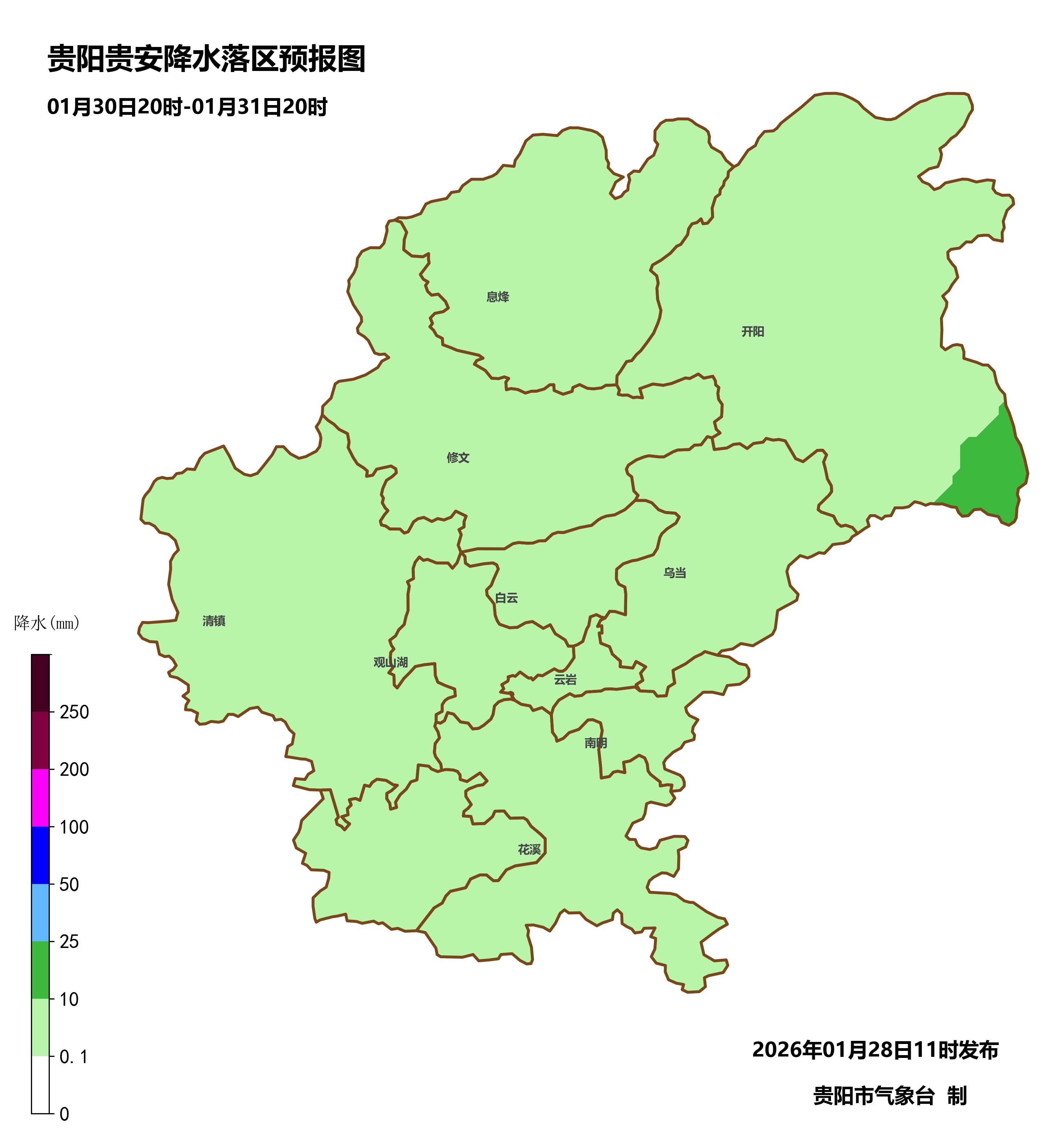 2026年1月29日夜间到30日白天,阴天有小雨,地势高处有雾,气温下降,气温:3~11℃