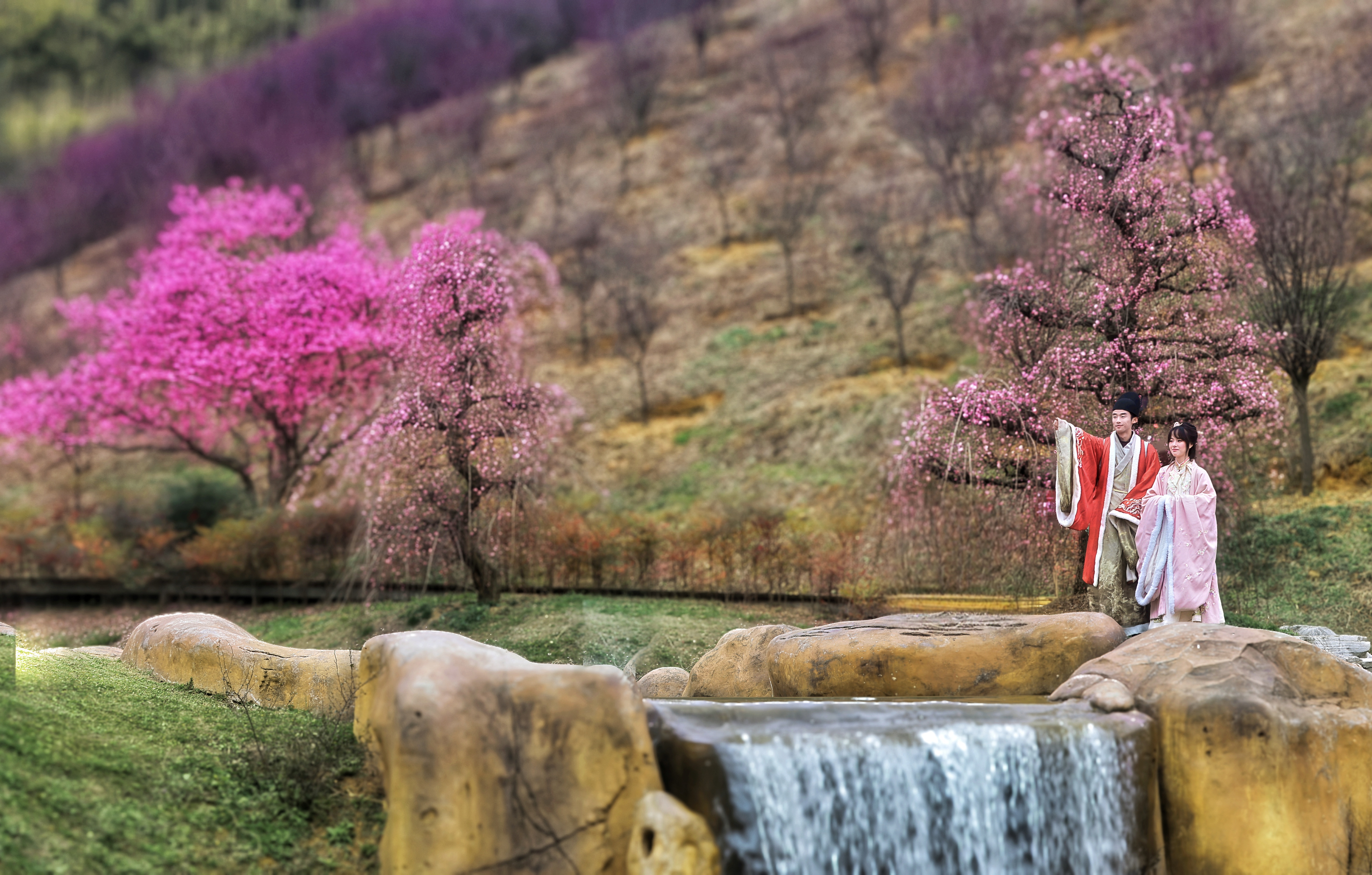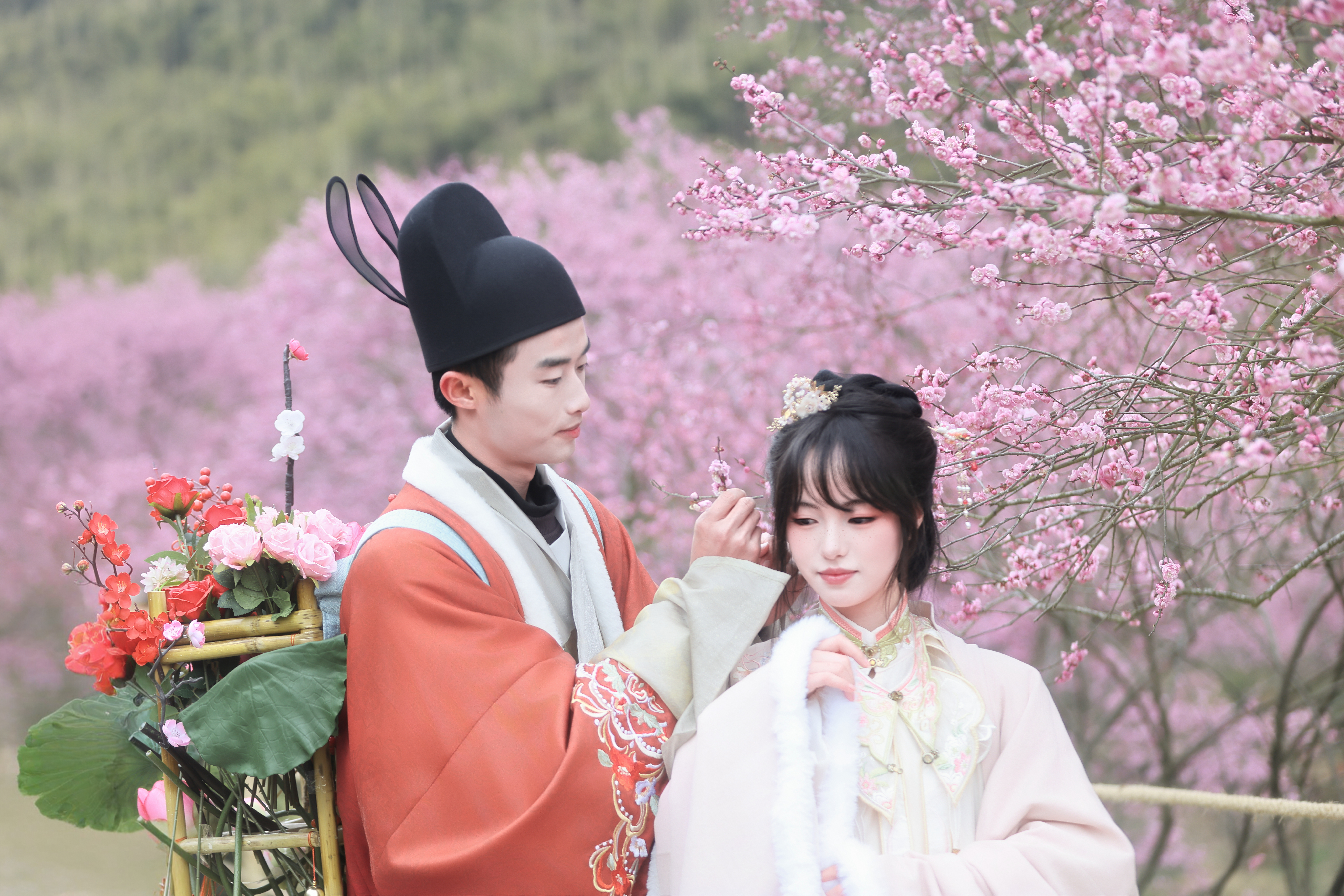 汉服爱好者在贵州梅园里拍摄“听说贵州梅园开园了,就按捺不住前来赏梅拍照打卡。”张晖笑着说道,手中的相机仍在不停运作。镜头下,梅园里的各种梅花竞相绽放,花瓣凝霜带露,楚楚动人;蜿蜒小径穿梭梅林,亭台楼阁错落其间,一步一景皆成画。