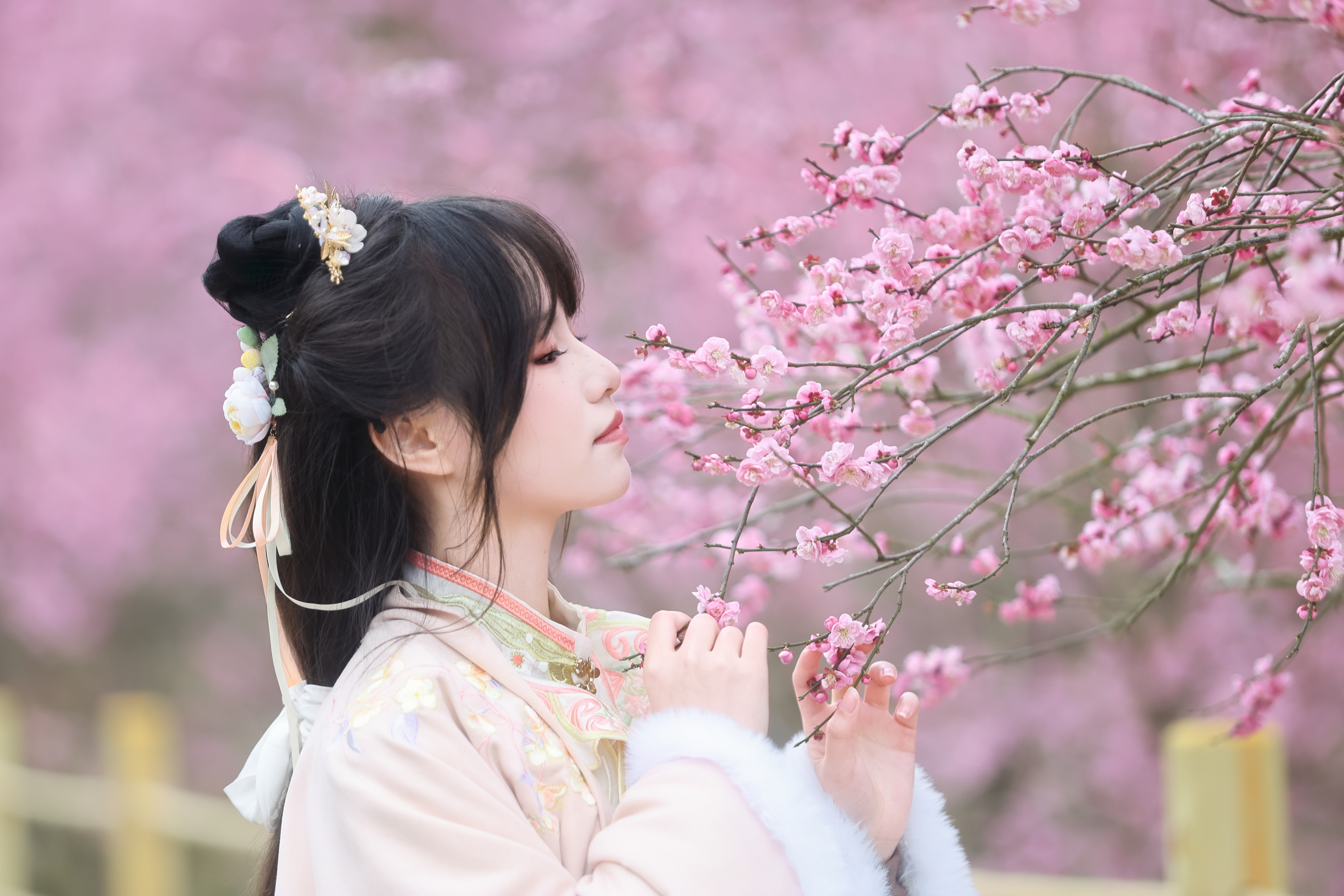 开园当天,梅园还上演了精彩的国风巡游,身着汉服、手持团扇的小姐姐们衣袂飘飘,穿行于梅林之间,与暗香浮动的梅花相映成趣,宛如画中仙子。张晖迅速调整机位,用长焦镜头定格下她们或回眸浅笑、或轻拂花枝、或缓步穿行的唯美瞬间,将古典韵味与冬日梅景完美融合,让每一张照片都充满诗情画意。赏梅游客或驻足嗅香、或合影留念,笑意盈盈的模样与盛放梅花、国风佳人共同构成了一幅灵动鲜活的冬日画卷。张晖时而俯身抓拍花朵特写,时而登高定格梅园全景,时而追拍巡游队伍,用专业镜头将这份冬日限定的美好一一留存。