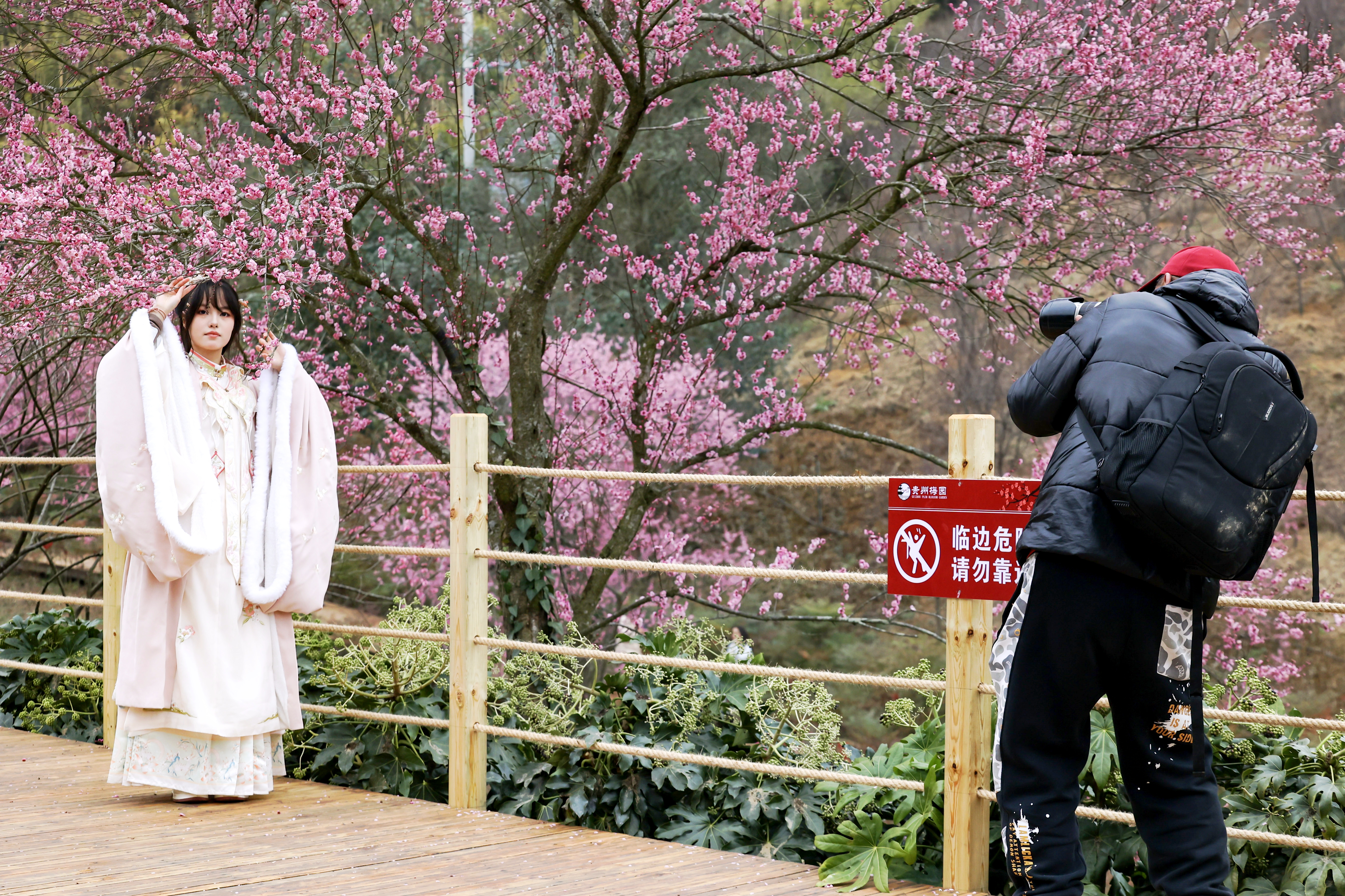 游客在梅园一景点打卡1月24日,位于贵安新区高峰镇的贵州梅园正式开园,现场一名背着专业摄影背包的游客频频按下快门,用镜头定格梅园盛景,他便是来自贵阳的资深专业摄影师张晖。